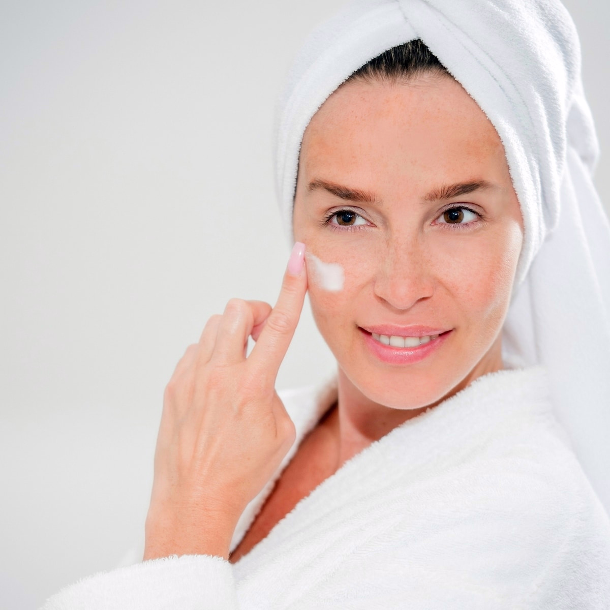 Use the flat of the hand to smooth from the center of the face outward with long strokes until fully absorbed.