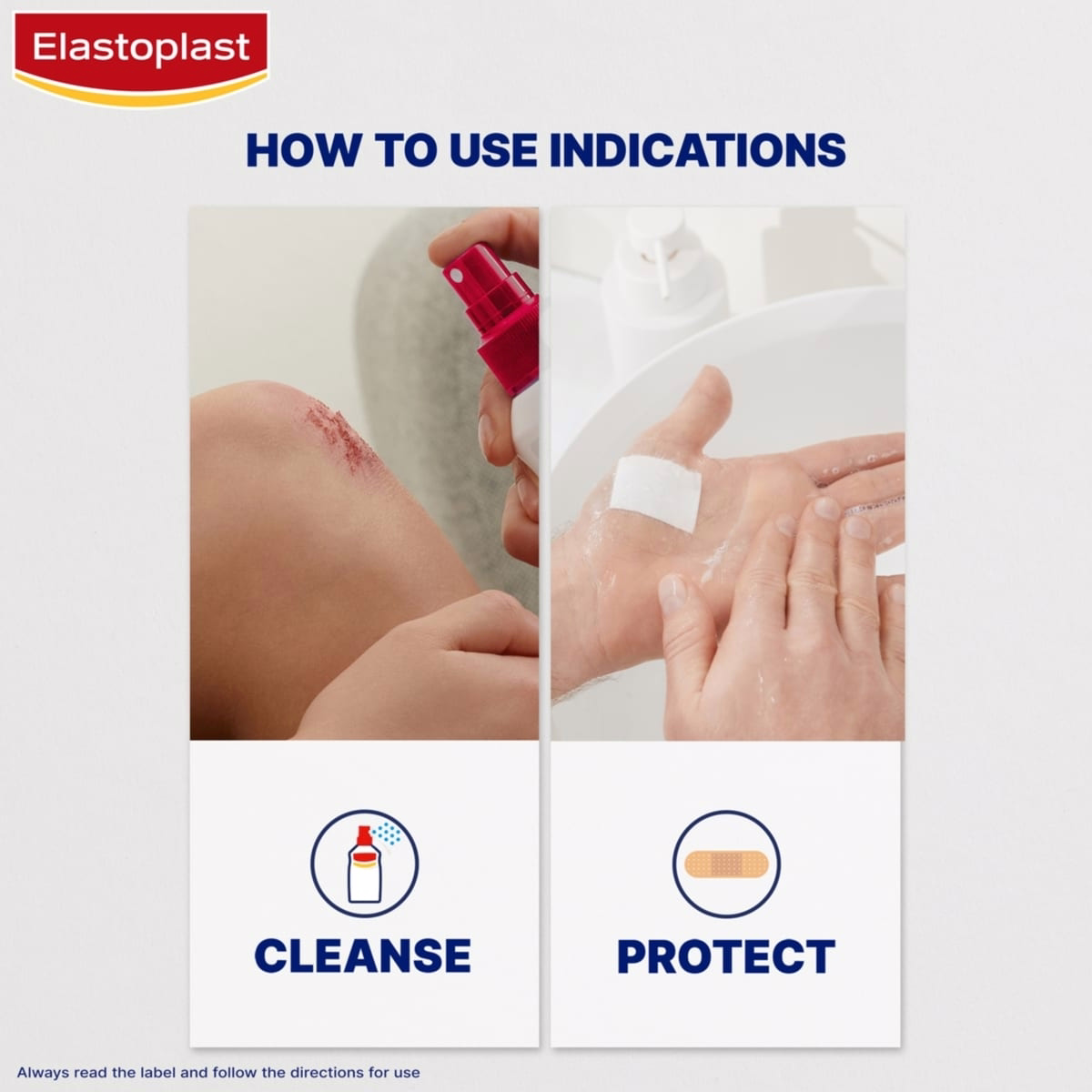 Cleanse the wound with Elastoplast Wound Spray. Dry the area with a sterile compress.