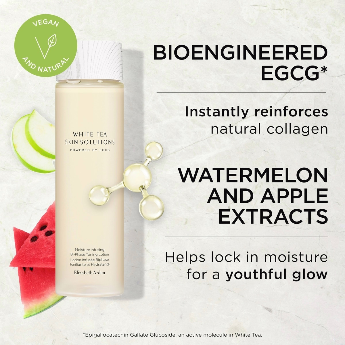 The White Tea Skin Solutions Moisture Infusing Bi-phase Toning Lotion from Elizabeth Arden helps restore skin moisture and refine texture. This soothing, alcohol-free treatment is powered by EGCG and is suitable for all skin types, including sensitive skin. The variant White Tea Skin Solutions Moisture Infusing Bi-phase Toning Lotion is designed to replenish moisture, smooth the complexion, and leave skin looking revitalized in just 7 days.
