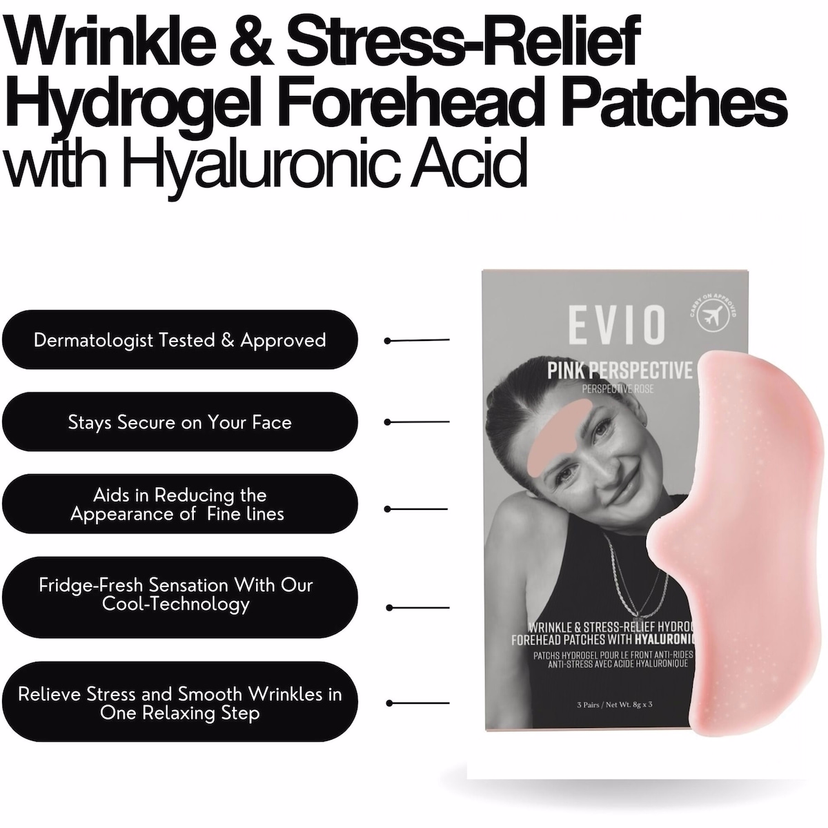 Pink Perspective Wrinkle + Stress Relief Forehead Patches with Hyaluronic Acid deliver hydrating care for stressed-out skin. This 3-Pack helps support a calmer, smoother-looking forehead and is suitable for those seeking hydration, barrier support, and a refreshed appearance. Dermatologist-approved and hypoallergenic, these patches are designed for daily use to help restore balance and resilience against environmental stressors.