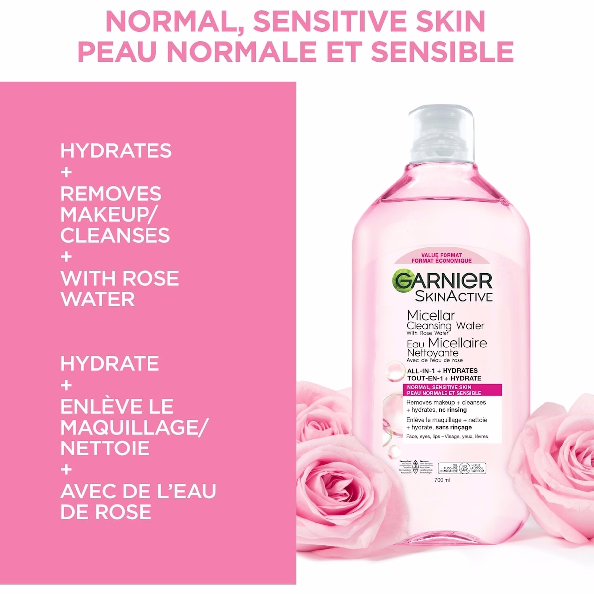 Garnier Micellar Cleansing Water, All-In One Hydrating Makeup Remover + Face Cleanser with Rose Water & Glycerin, Hypoallergenic, Sensitive to Dry SkiGarnier Micellar Cleansing Water All-In-One Hydrating 700 mL
