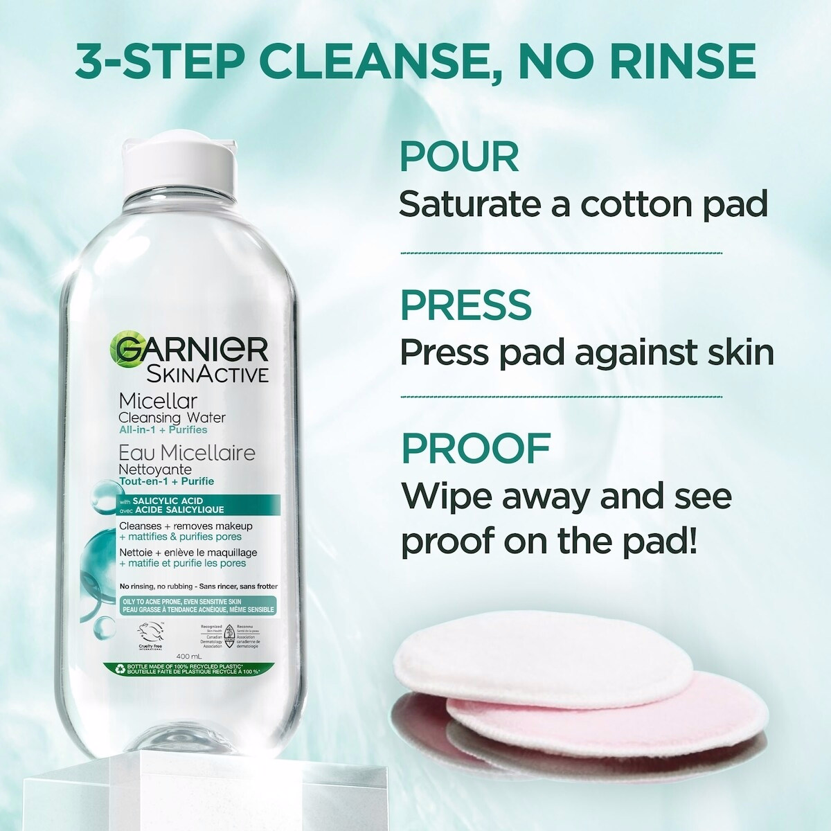 - Saturate a Garnier reusable Eco Pad or a cotton pad, apply onto face, eyes, and lips and gently wipe away without rubbing.