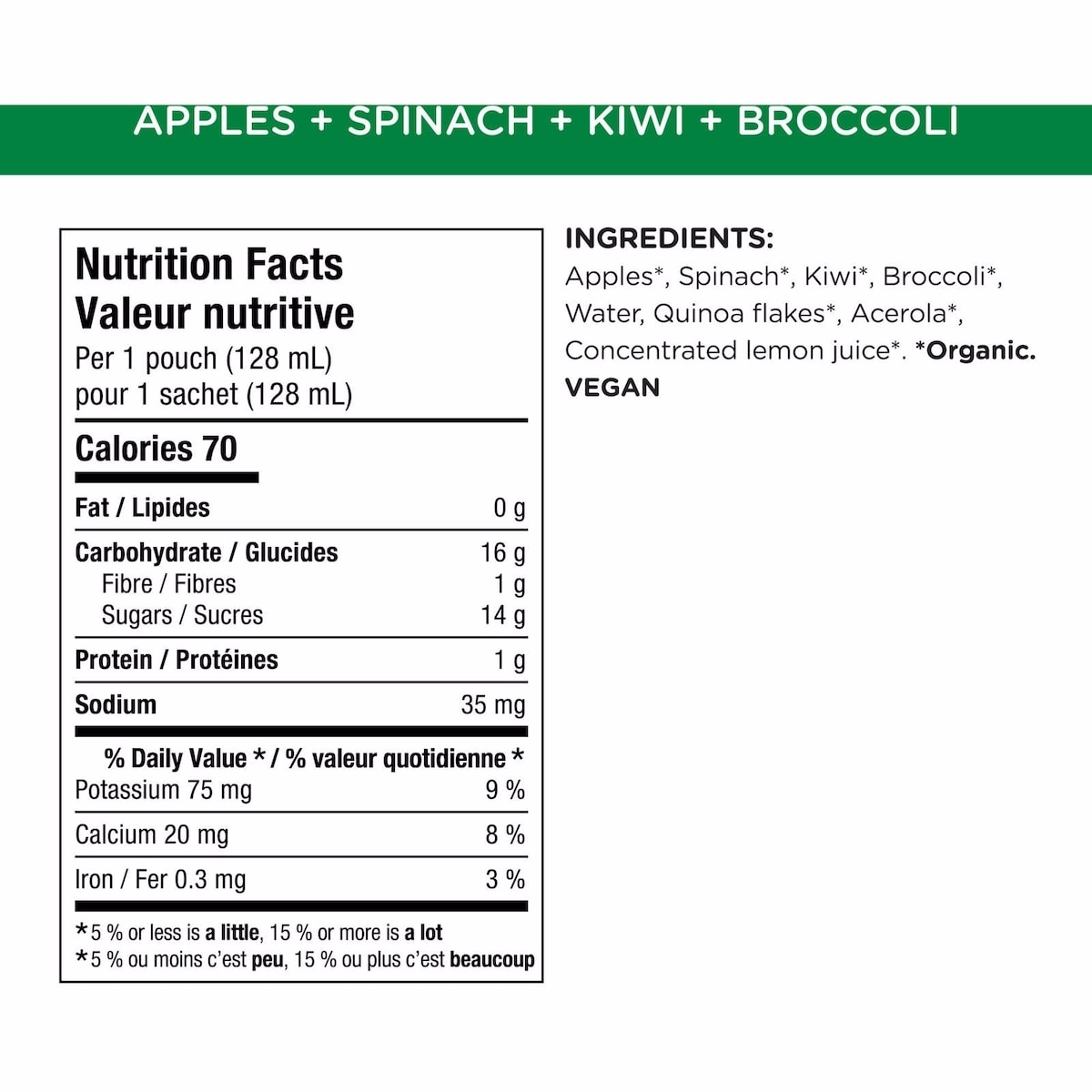It combines organic apples, spinach, kiwi, broccoli, water, quinoa, acerola, and lemon juice concentrate for a nutritious greens-forward option with a tangy kiwi note.