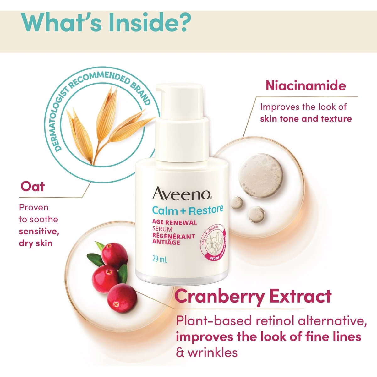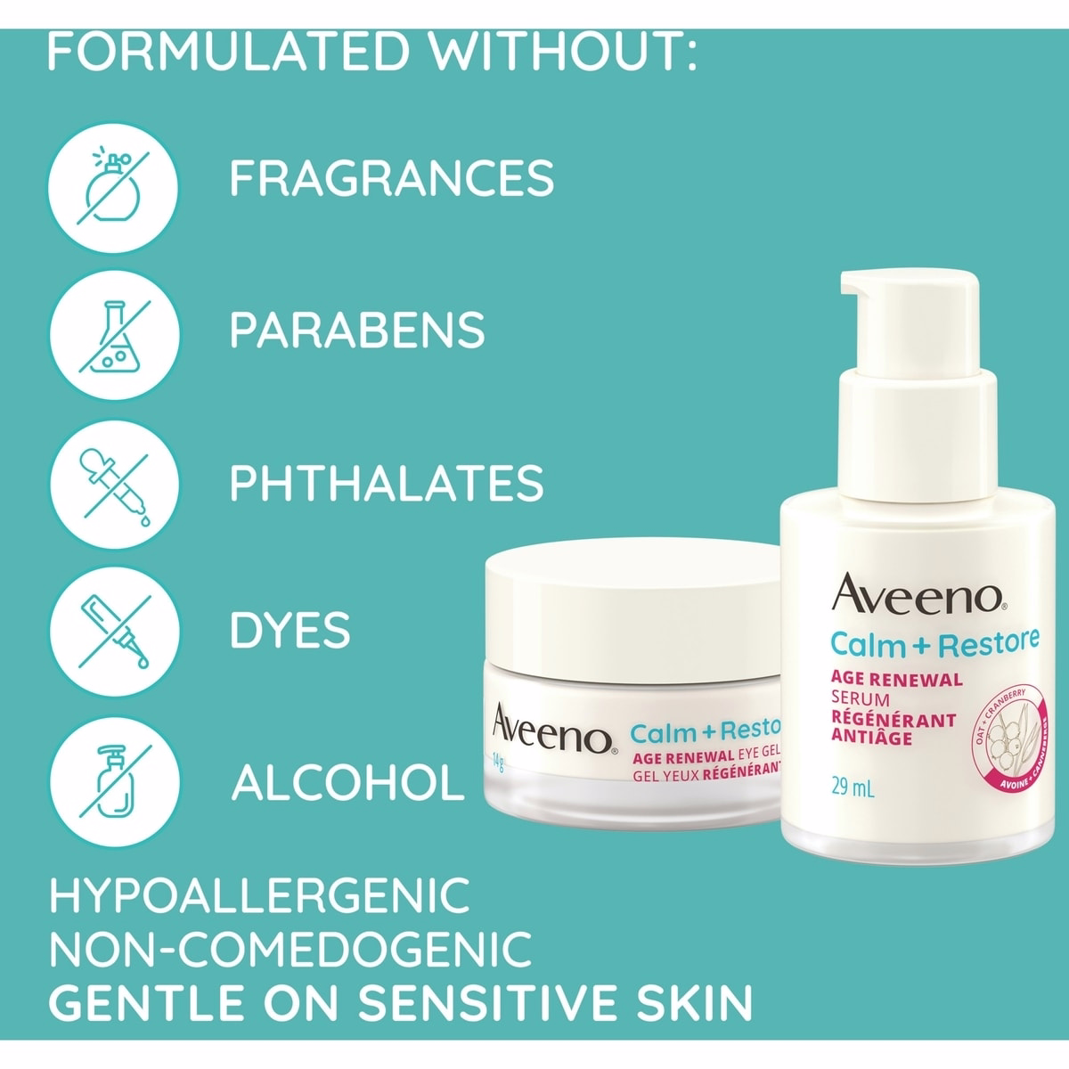 Aveeno’s Calm + Restore Age Renewal Serum is fragrance-free, paraben-free, phthalate-free, dye-free, alcohol-free, and non-comedogenic, supporting comfortable daily use as part of your skincare routine.