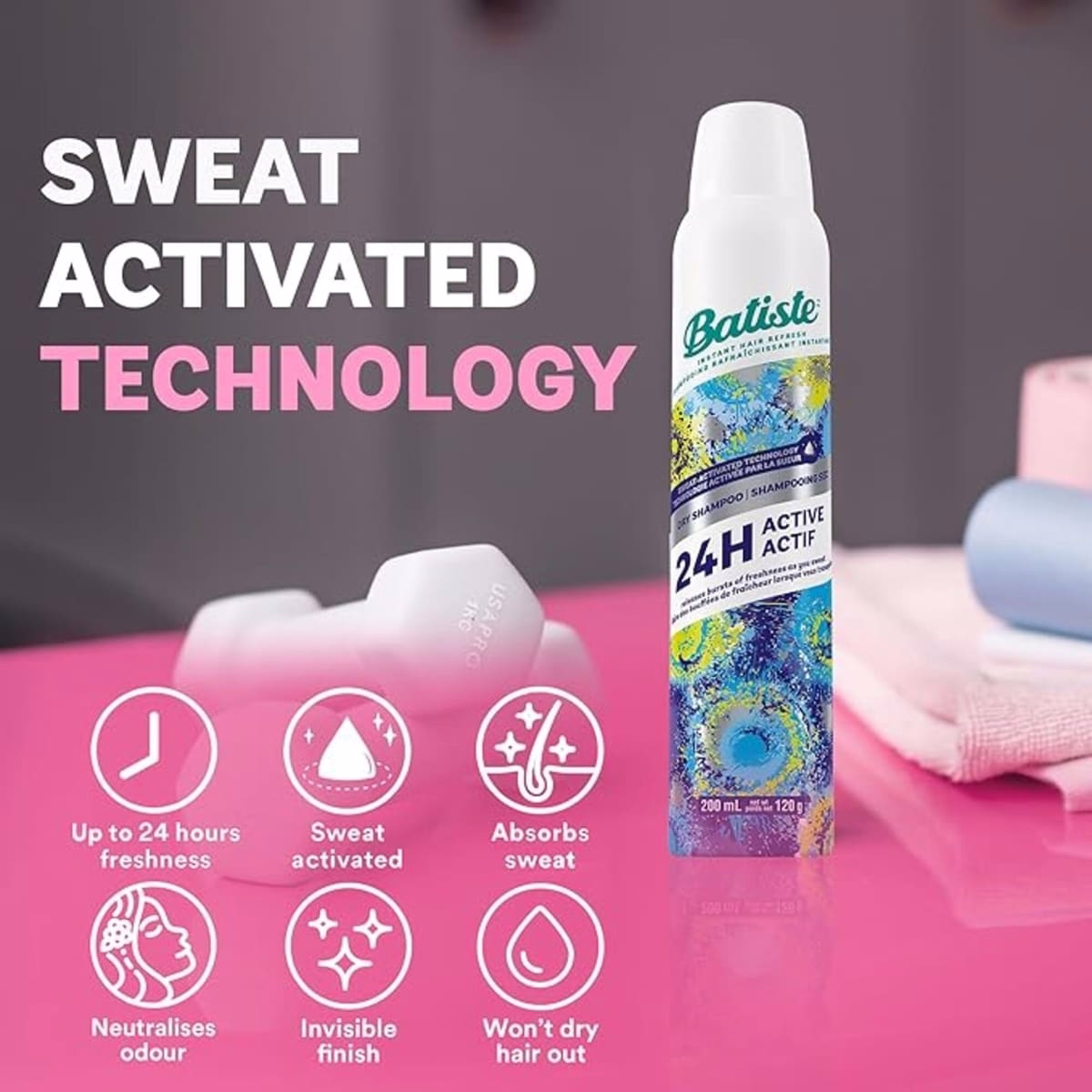 The full product you’ll reach for when you need a quick refresh is the Batiste Sweat Activated Dry Shampoo 24H Active. This waterless formula targets roots to help you feel cleaner and fresher between washes, and it’s designed for everyone on the go.