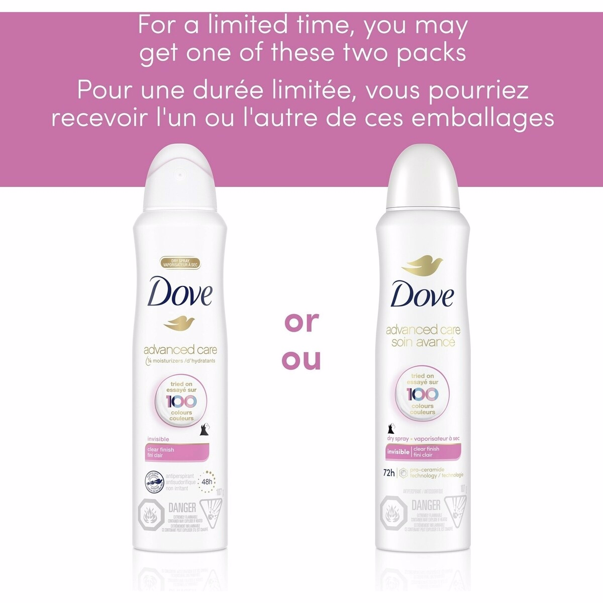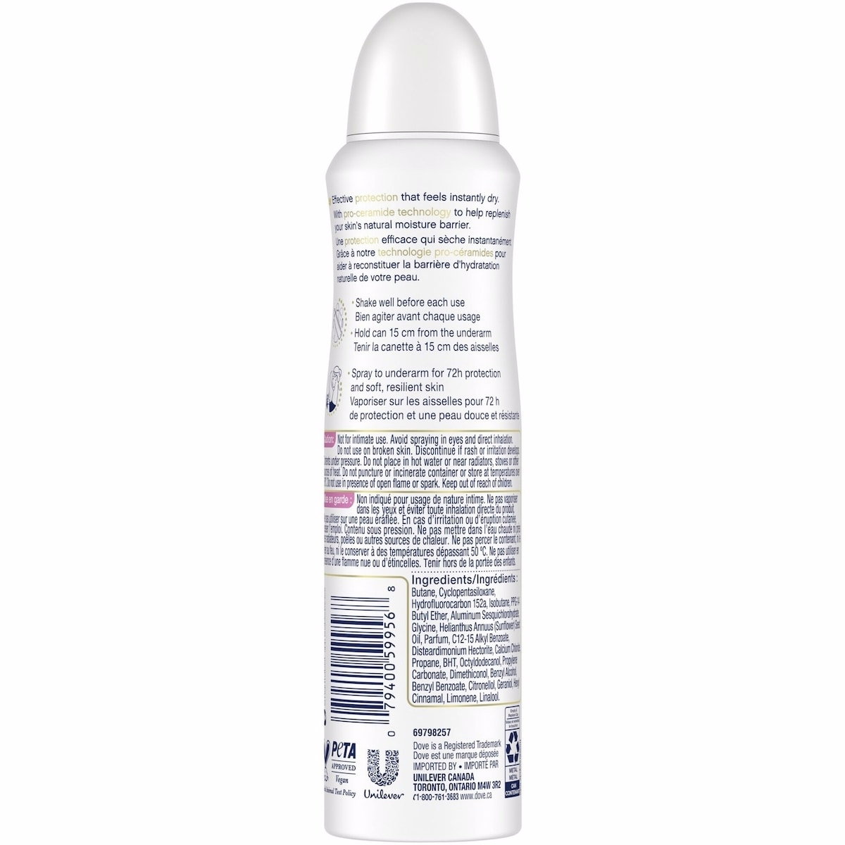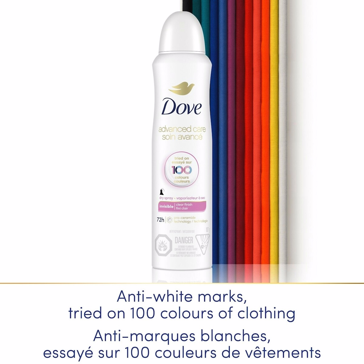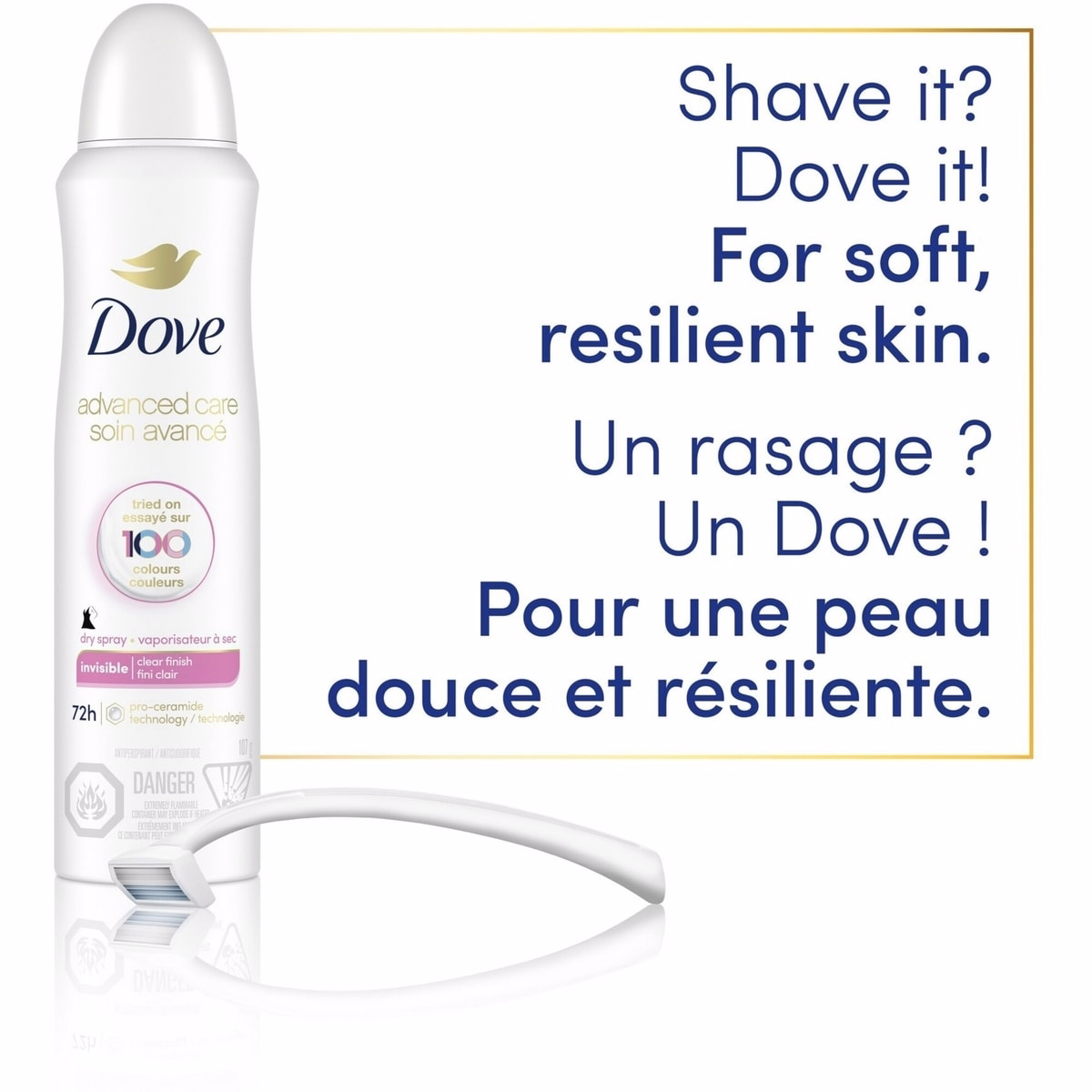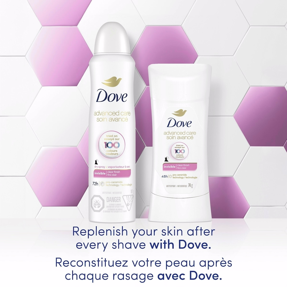 Dove Advanced Care Invisible Clear Finish Dry Spray Antiperspirant Deodorant for Women Clear Finish Scent with Pro-Ceramide Technology for Soft, Resilient Skin. It is designed to provide long-lasting protection while helping to restore your skin’s moisture barrier after shaving. This antiperspirant is ideal for women seeking an invisible finish and a fragrance-free feel with a refreshing scent experience. It supports skin resilience and odor control across a full 72-hour period, so you can feel confident throughout the day and into the night.