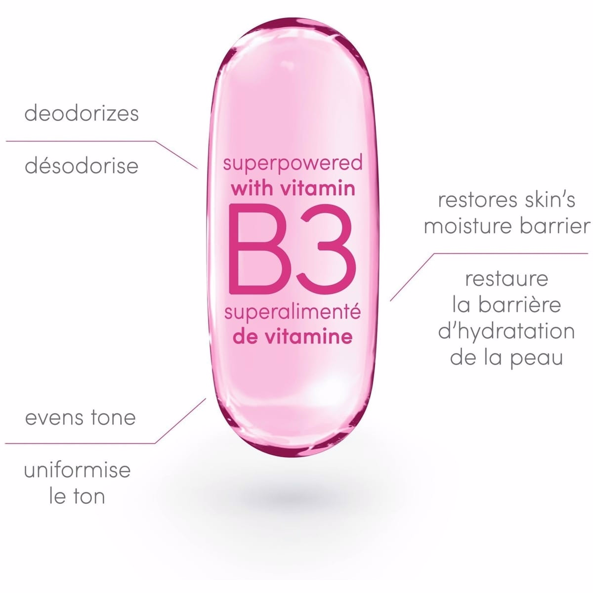 - SUPERPOWERED WITH VITAMINS: vitamin-fortified odour control with skin care powerhouse Vitamin B3 (niacinamide) and Vitamin E.
