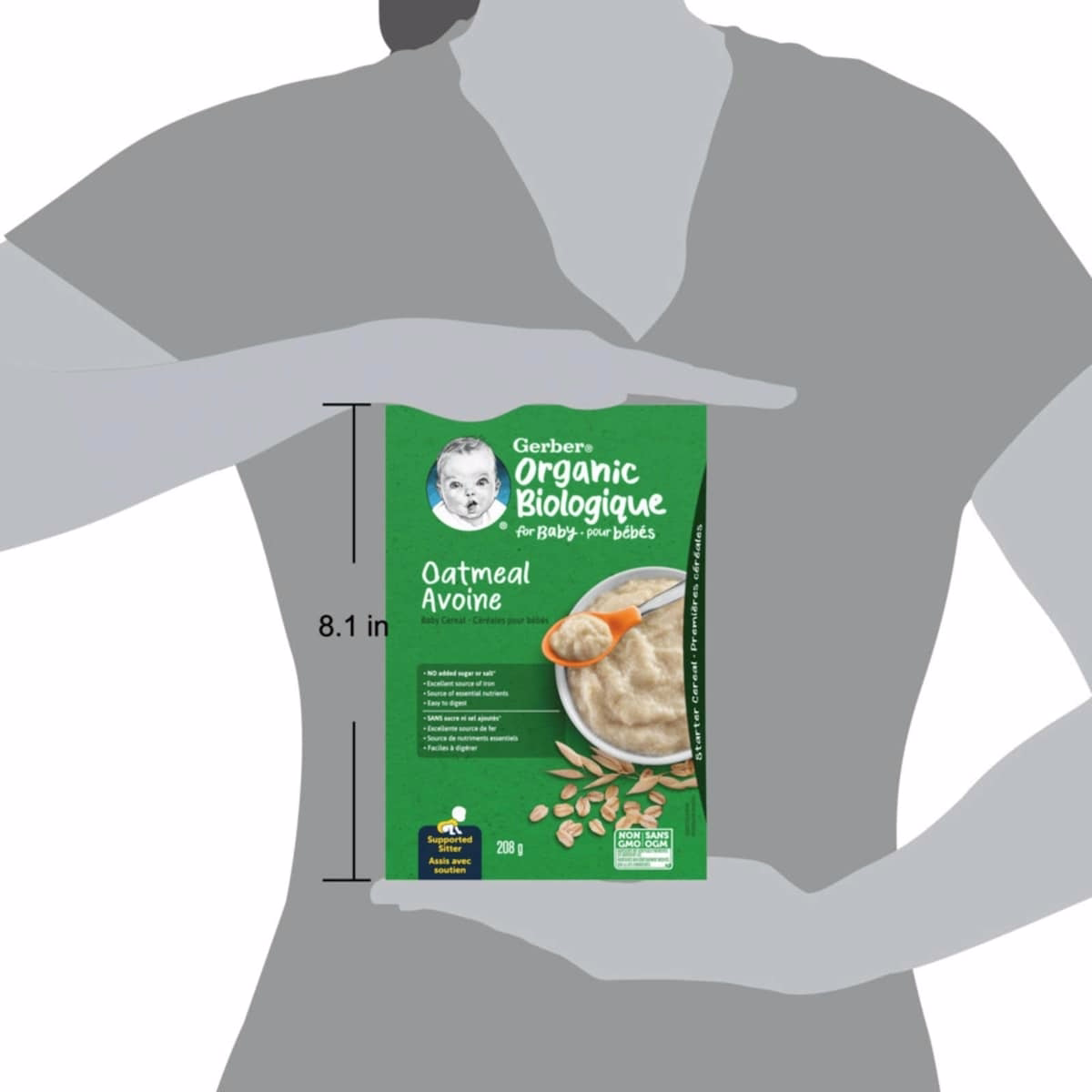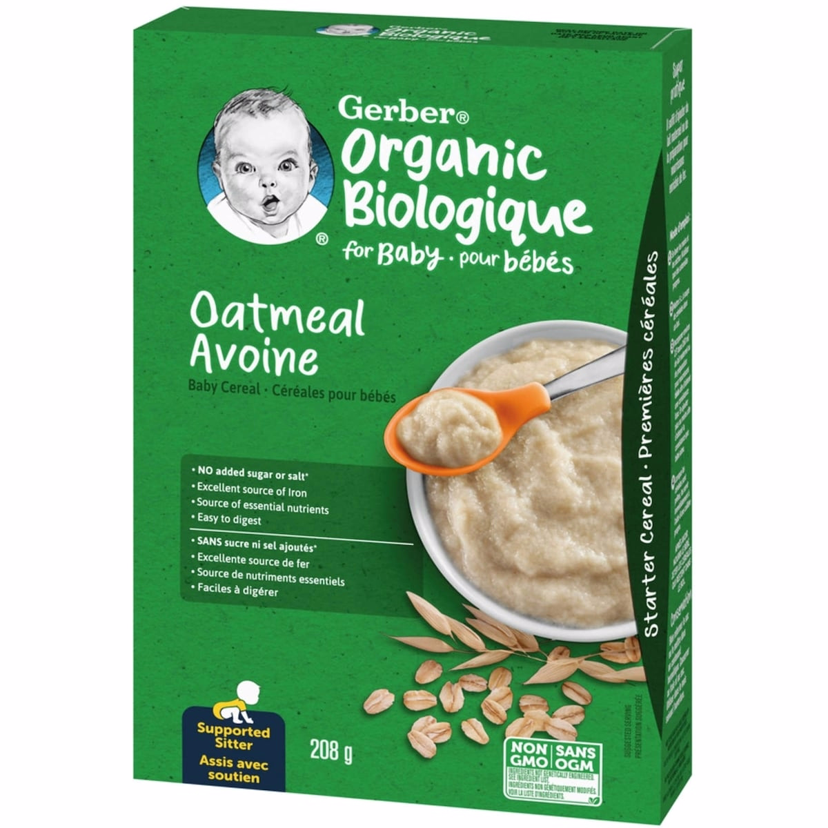 Specifics: 208.0 (variant_name: Organic Baby Cereal Oatmeal; name: Organic Baby Cereal Oatmeal; brand_name: Gerber; size_unit: G). This product is designed for babies starting on solids and is intended to be iron-fortified as part of a healthy infant diet.