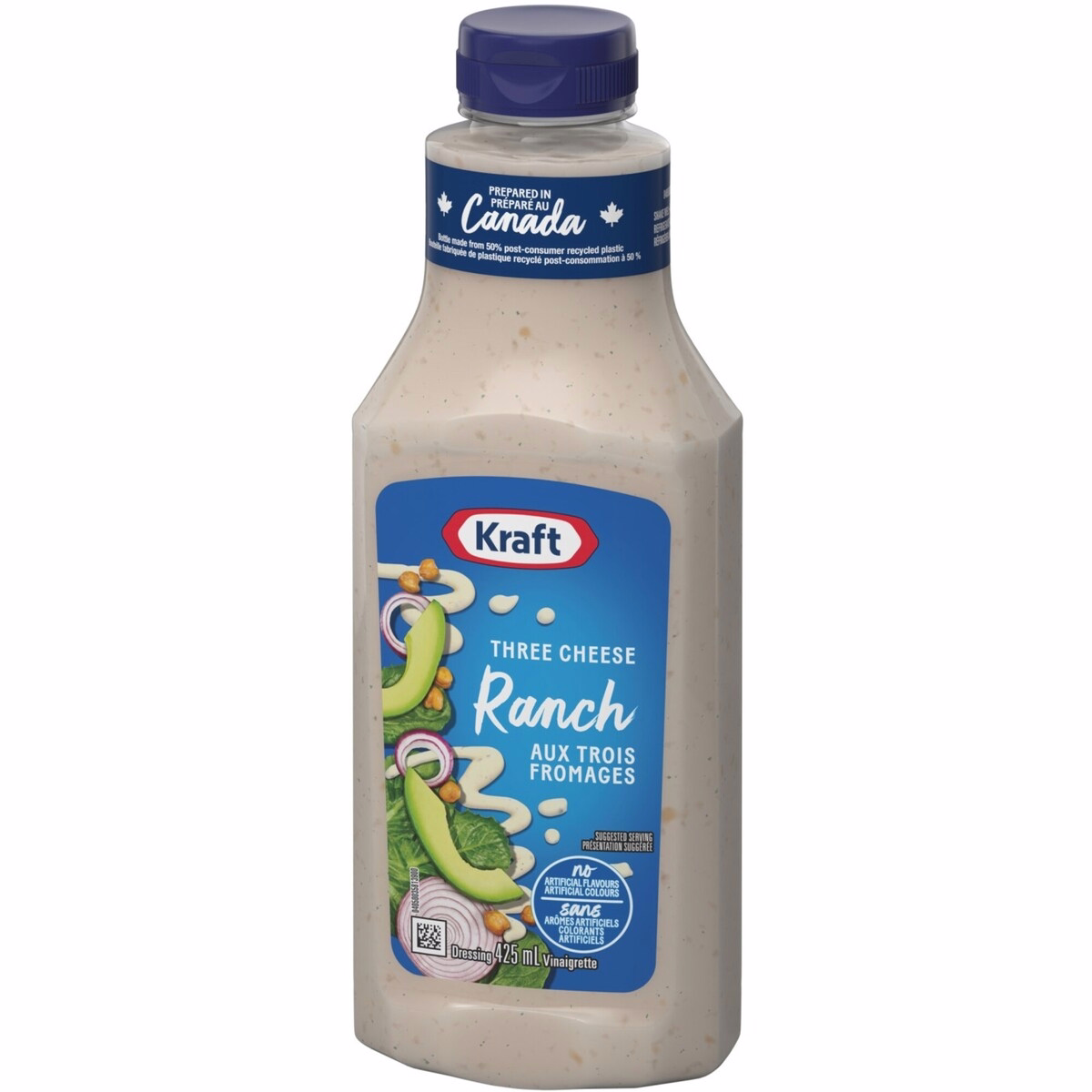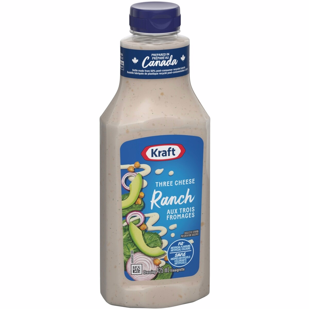 The Dressing Three Cheese Ranch is a Kraft condiment designed to add rich, creamy flavor to salads, vegetables, and wraps. This 425 ML bottle delivers a savory blend that pairs well with a wide range of foods, making it a versatile staple for casual meals and entertaining.