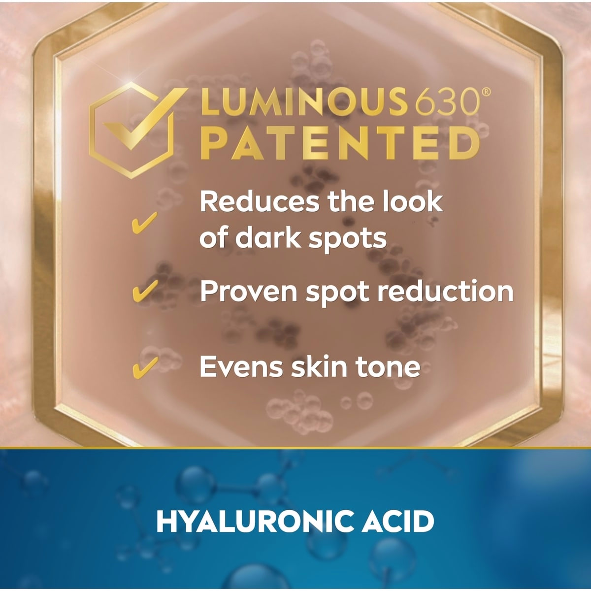 - PATENTED LUMINOUS630: A proprietary ingredient that works with the skin’s own processes to reduce the look of dark spots.