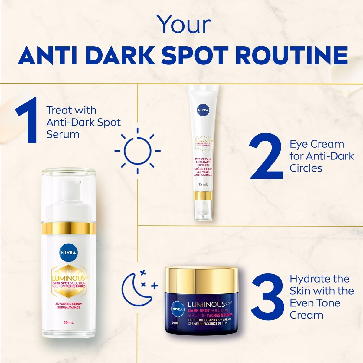 - DARK SPOT ROUTINE COMPATIBLE: For best results, use with NIVEA LUMINOUS630 Eye Cream and Advanced Serum.