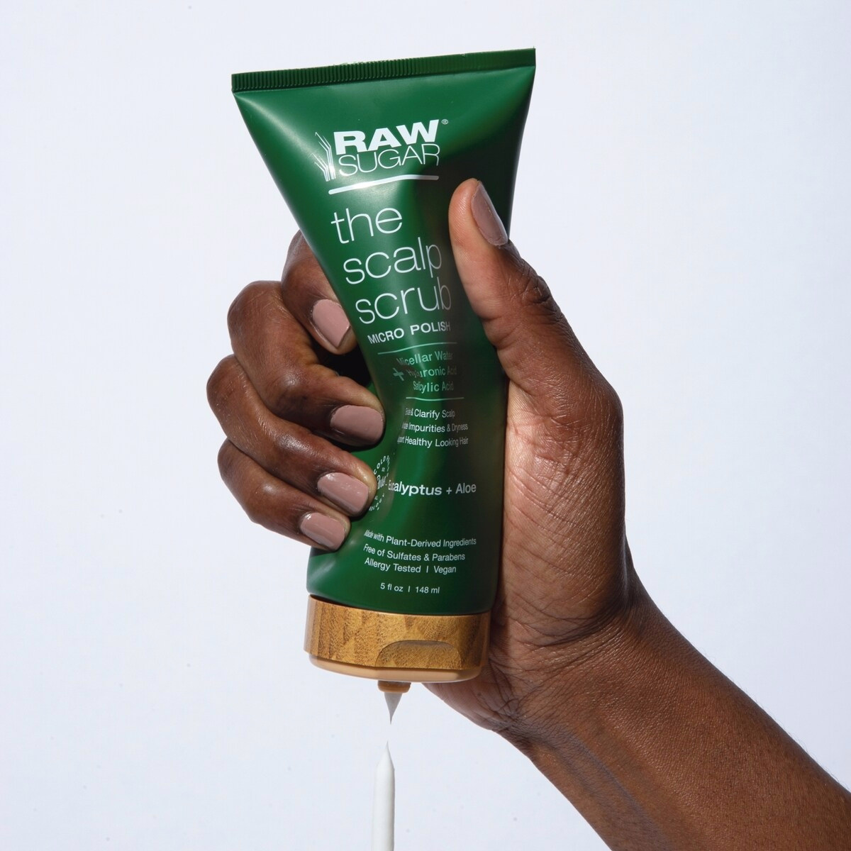 Dispense an appropriate amount and massage the scrub into the scalp using small circular motions for 1-2 minutes.