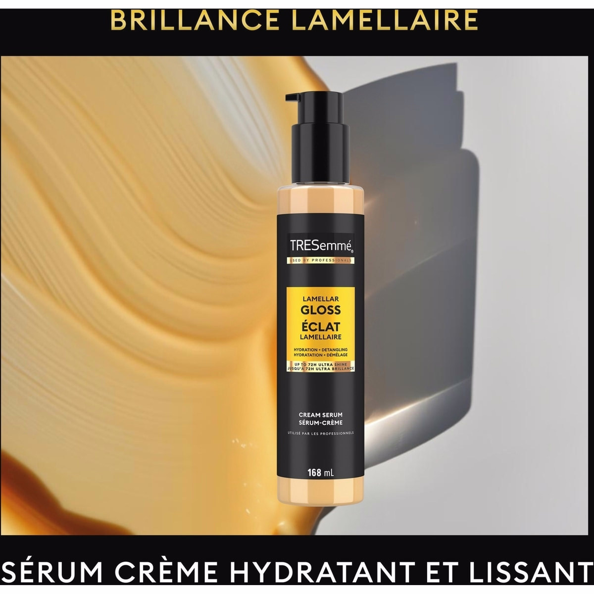 TRESemmé Cream Serum Lamellar Gloss for up to 72H Ultra Shine is a lightweight hair treatment designed to hydrate, detangle, and deliver a salon-grade glossy finish. Formulated for versatile use, it can serve as a leave-in conditioner, a rinse-off treatment, or a pre-shampoo step, providing up to 72 hours of luminous shine. The Lamellar Gloss system, powered by Lamellar Lamination, works to smooth each strand for a sleek, polished look that lasts. This product is part of the Lamellar Gloss Collection and embodies the brand’s commitment to professional-quality results at home.