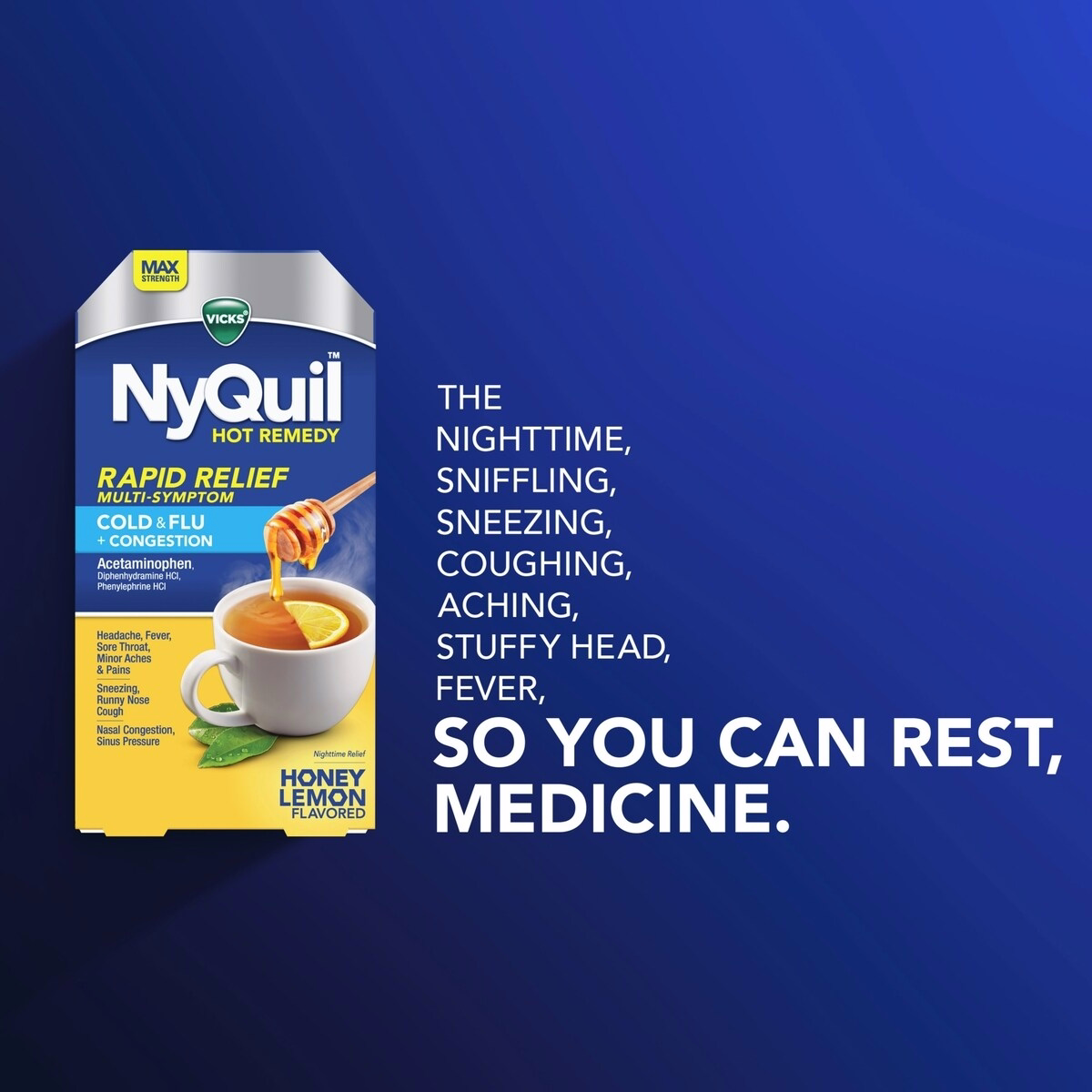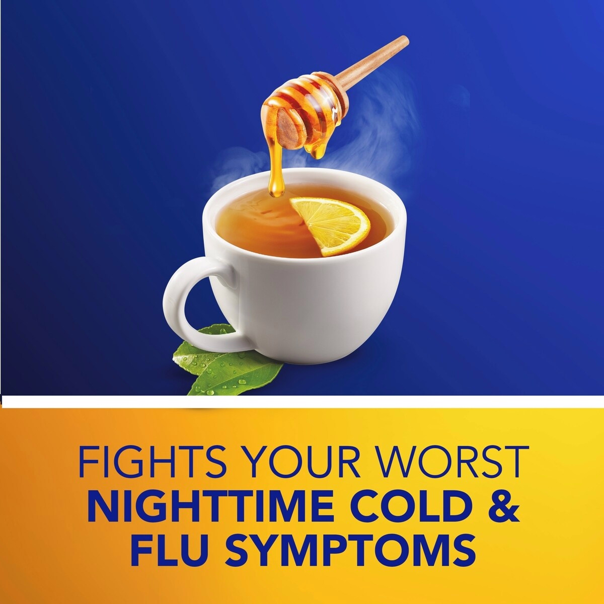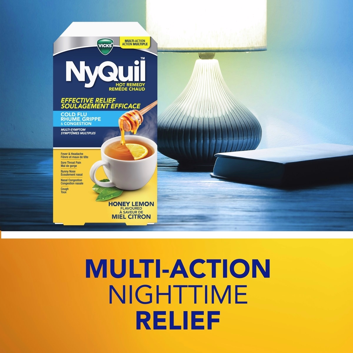 The NyQuil Hot Remedy Cold, Flu & Congestion Medicine, Nighttime, Relief for Fever & Headache, Sore Throat Pain, Nasal Congestion, Runny Nose, Cough, Multi-Action, Honey Lemon Flavoured is a nighttime OTC medication designed to ease multiple cold and flu symptoms. This product combines active ingredients to help you rest easier while addressing fever, head and body aches, sore throat, congestion, and cough. It is intended for adults and children 12 years and over. Always read and follow the label directions and keep out of reach of children.