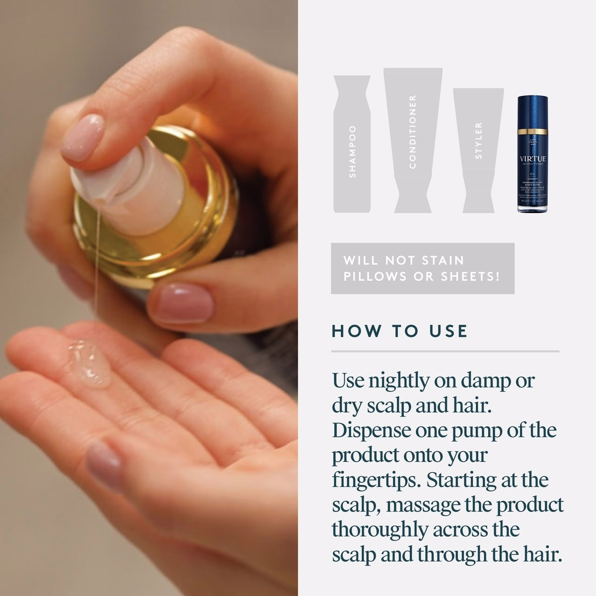Use nightly on damp or dry scalp and hair. Dispense one pump onto your fingertips, starting at the scalp and massaging thoroughly across the scalp and through the hair. Repeat as needed.