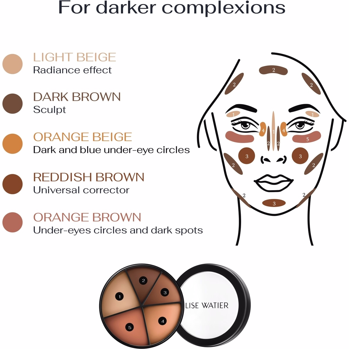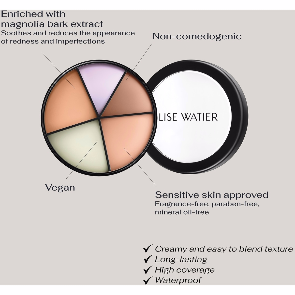 - Five correcting creams in one palette to conceal targeted imperfections with precision.