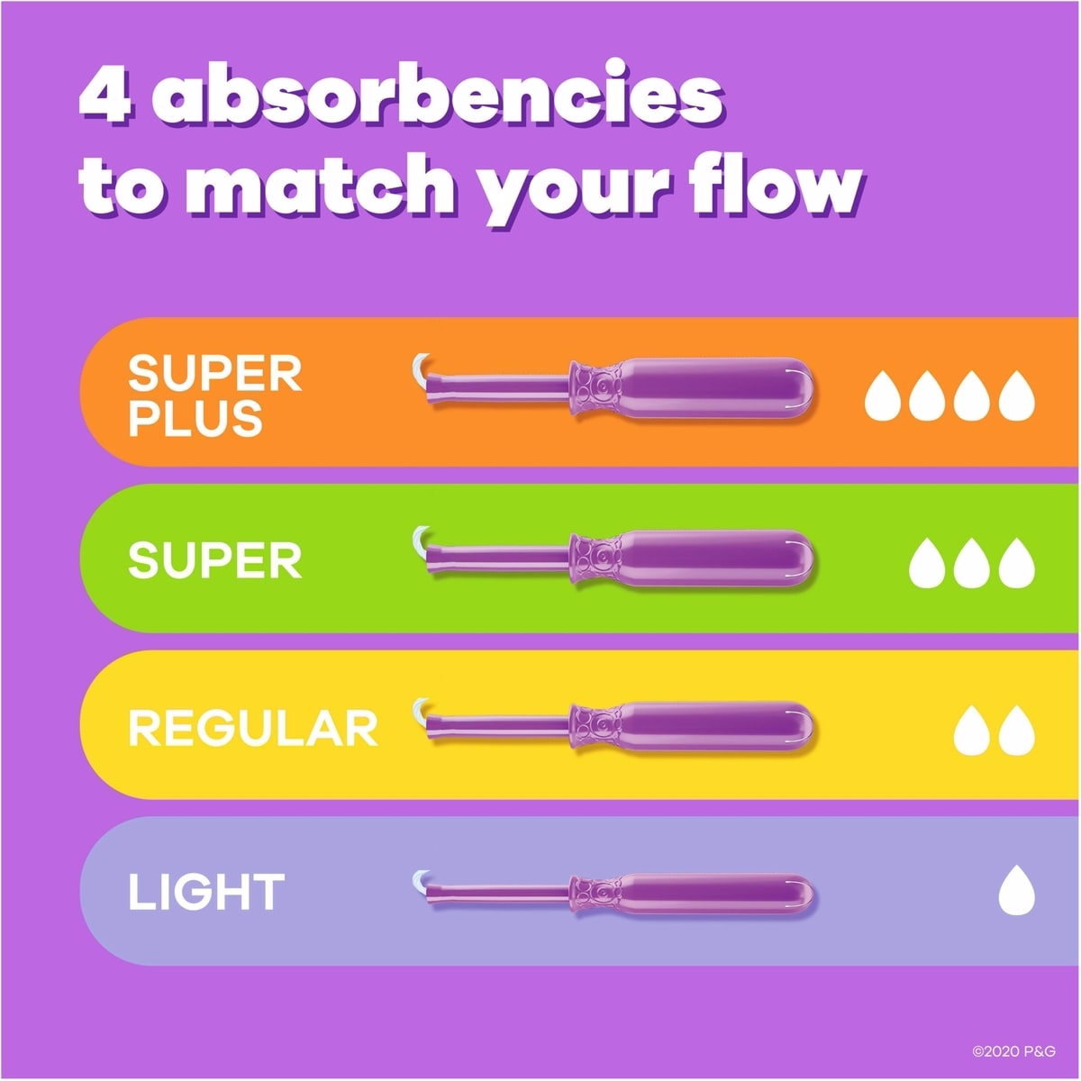 - Regular, Super, and Plus absorbencies provide options to match varying flow levels.