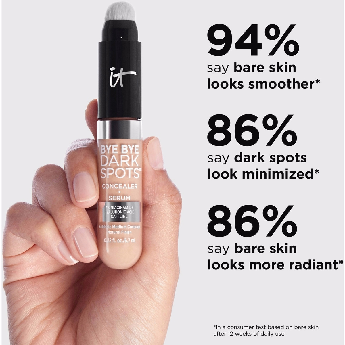 The full product name It Cosmetics Bye Bye Dark Spots Concealer + Serum with 2% Niacinamide is designed to provide instant natural coverage while helping fade the appearance of dark spots and under-eye concerns over time. This buildable, medium-coverage concealer combines makeup with skincare benefits, making it a versatile choice for those seeking both coverage and gradual skin improvement. Suitable for all skin types, including sensitive skin, the formula supports hydration for a comfortable finish that layers well with other makeup.
