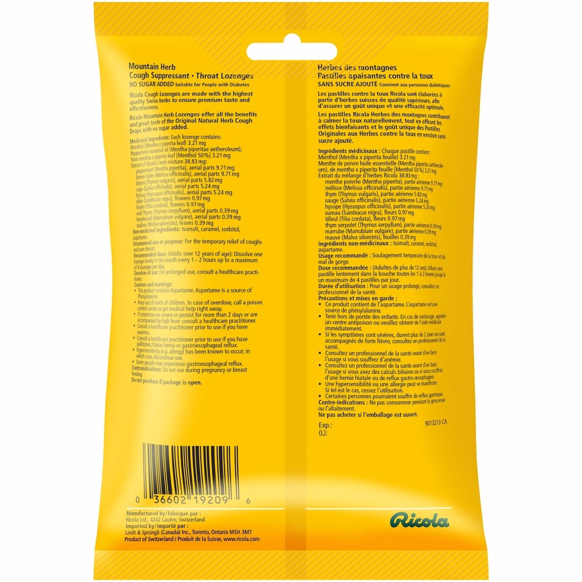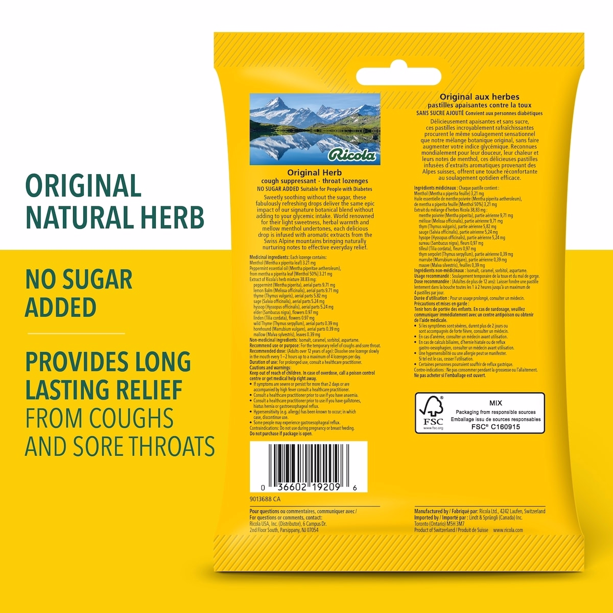 Ricola Herb Cough Drops Original are throat lozenges intended for temporary relief of throat irritation and mild coughs. Suitable for adults and older children seeking soothing relief.