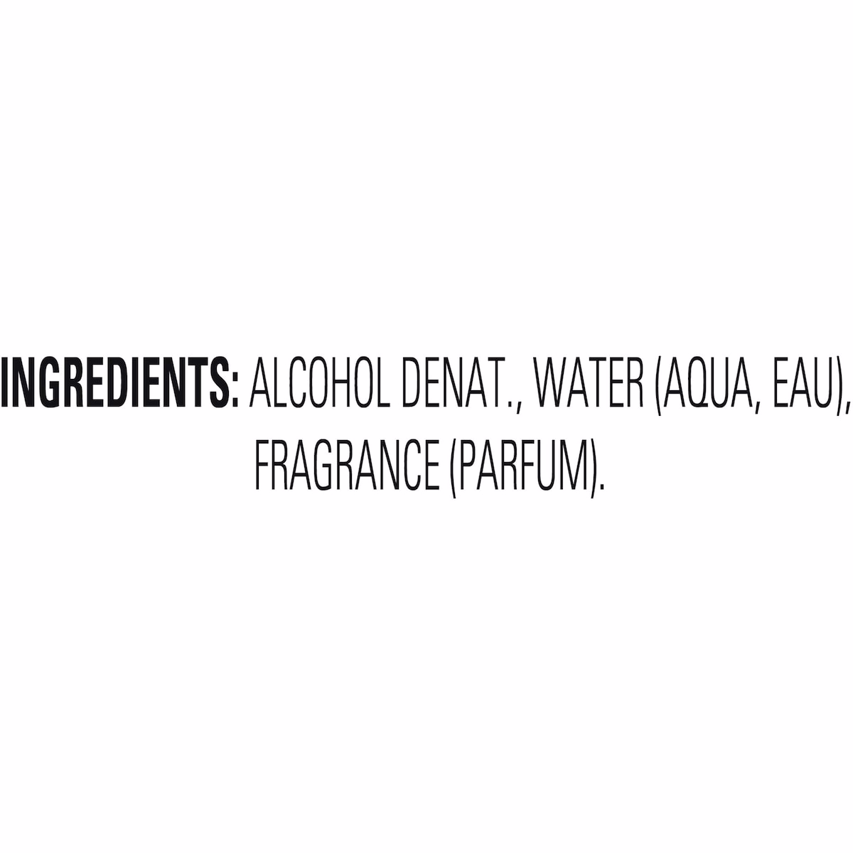 The formula uses Alcohol (Denat.), Water (Aqua, Eau) and Fragrance (Parfum). If you have sensitive skin, test on a small area first and discontinue if irritation occurs.