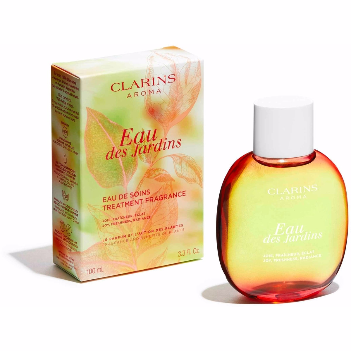 Eau des Jardins by Clarins is a floral, uplifting treatment fragrance with 93% natural ingredients. A 100 mL bottle featuring citrus top notes and a green, nature-inspired vibe for a glow-boosting, energizing experience.