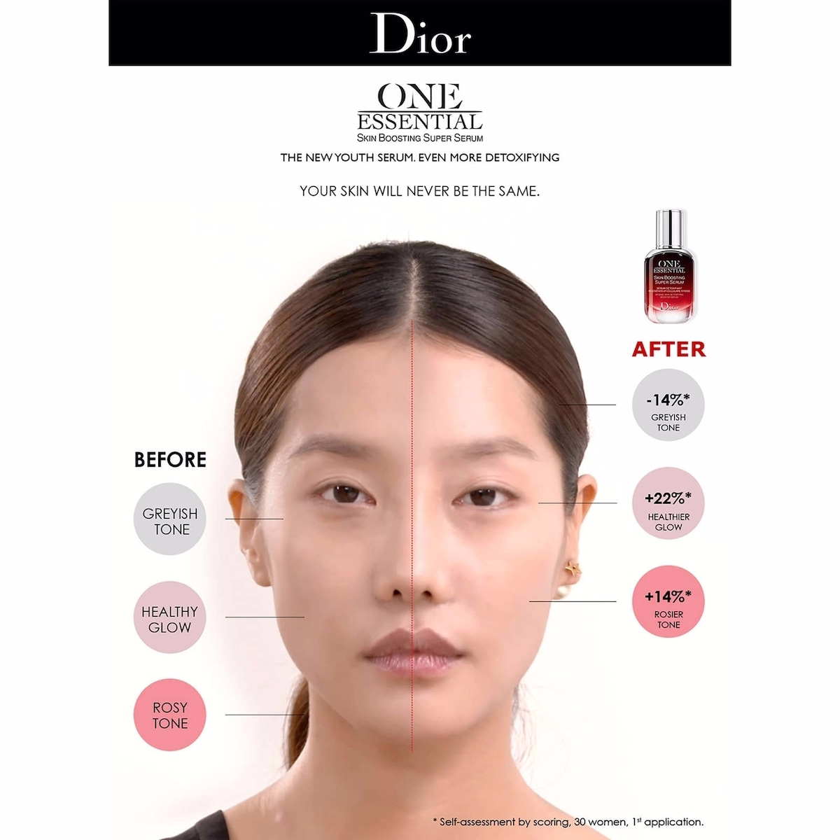 The full name One Essential – Skin Boosting Super Serum defines a skincare essential that detoxifies, regenerates, and boosts the skin for a revitalized complexion. This serum targets daily aggressors like UV rays, stress, and pollution, offering a more powerful formula that now addresses outdoor and indoor toxins. This product is intended for daily use to support a radiant, refreshed complexion.