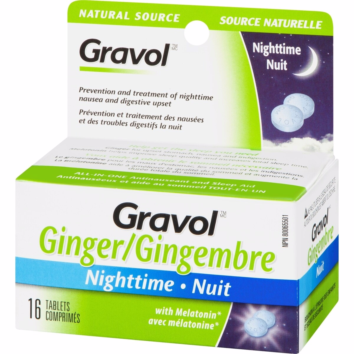 Gravol Ginger Nighttime Tablets with Melatonin help you sleep and relieve nighttime nausea, making them a practical option for adults seeking relief from travel discomfort and sleepless nights. This all-in-one tablet combines traditional nausea relief with a sleep-supporting melatonin dose to help improve sleep quality and increase total sleep time. The active ginger component is derived from Certified Organic ginger, traditionally used in Herbal Medicine to relieve nausea and digestive upset.