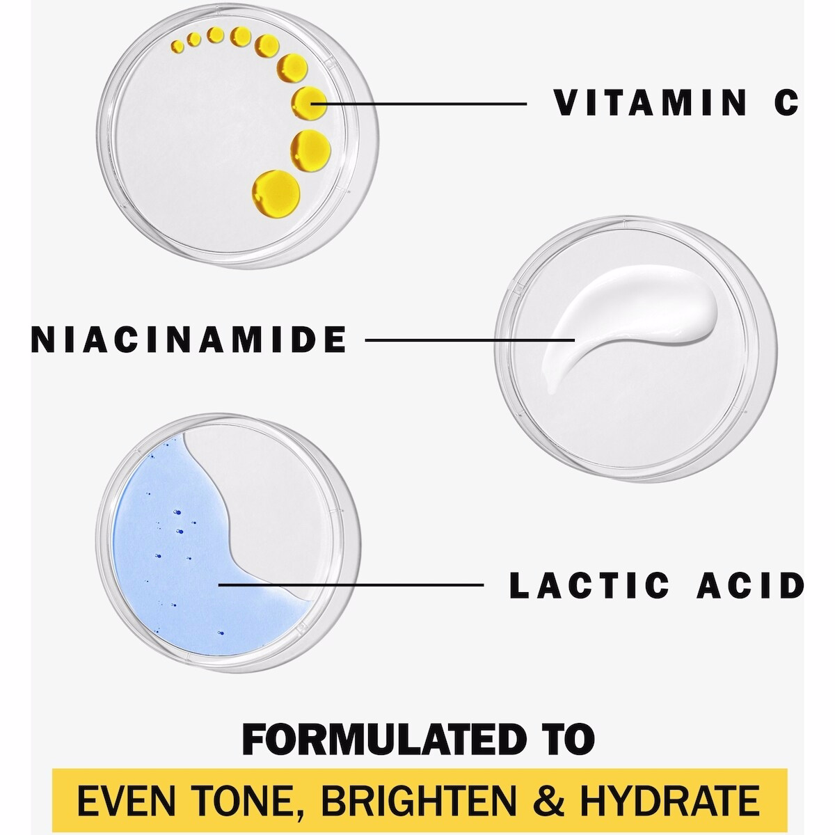 Vitamin C is a central brightening ingredient, complemented by Niacinamide (Vitamin B3) and Lactic Acid for gentle exfoliation and even tone.