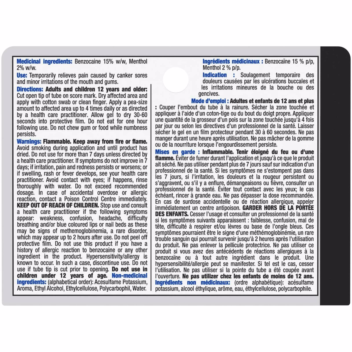 Medicinal ingredients are Benzocaine 15% w/w and Menthol 2% w/w. Non-medicinal ingredients include acesulfame potassium, aqua, aroma, ethyl cellulose, and polycarbophil.