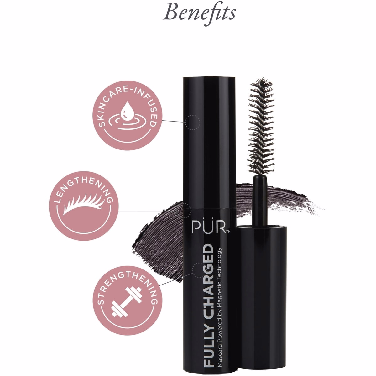 - Fully Charged Mascara wand at the base of lashes adds definition with a back-and-forth wiggle to build volume.