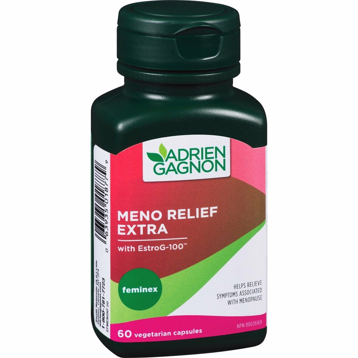 Feminex Meno Relief Extra by Adrien Gagnon is a menopause relief supplement in 60 Capsules. It uses EstroG-100 and root extracts to support hot flashes, sleep, and vaginal dryness, offering a non-isoflavone option for symptom relief.