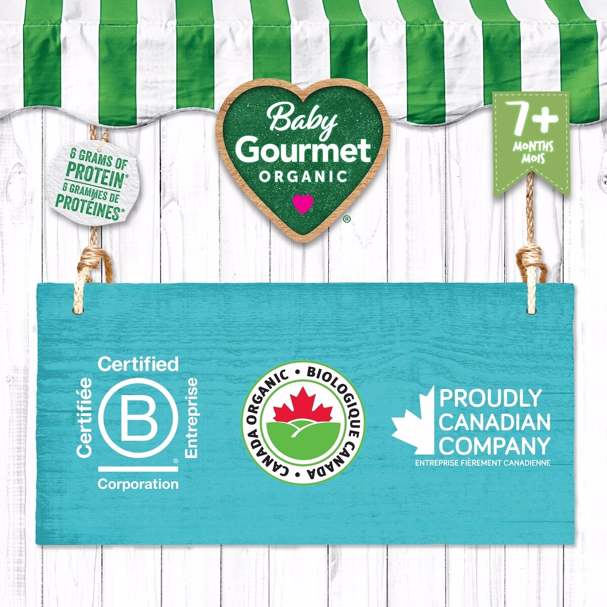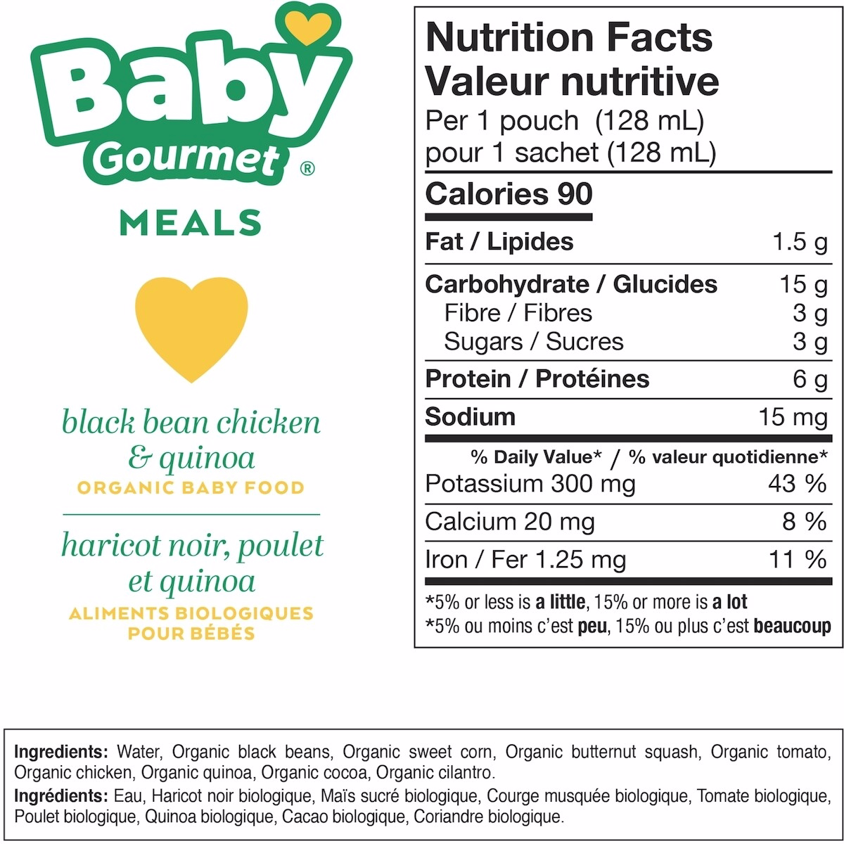 The Black Bean Chicken & Quinoa option from Baby Gourmet is a wholesome, ready-to-serve meal designed for little eaters who crave flavor and nutrition. This 128 mL pouch delivers a fresh and unique combination of sweet corn, quinoa, chicken, black beans, and a hint of cilantro, with a surprising cocoa note to enrich the taste experience for curious palates.