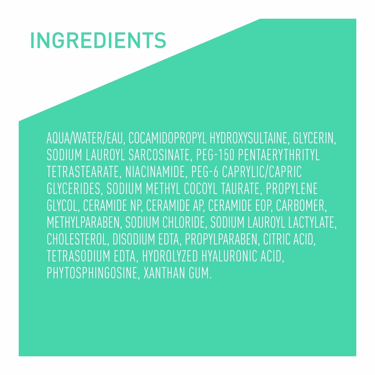 Ceramide NP, AP, and EOP support skin barrier function; hyaluronic acid helps retain hydration; niacinamide soothes the skin and supports barrier health.