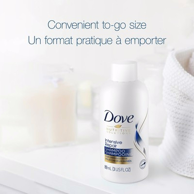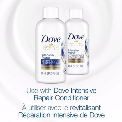 Dove Nutritive Solutions Intensive Repair Shampoo with Keratin Repair Actives is a daily-use shampoo for damaged hair. It helps reinforce against breakage and works best with the Intensive Repair Conditioner for strong, smooth hair—89 ML? No, 89 ML. 89 ML.