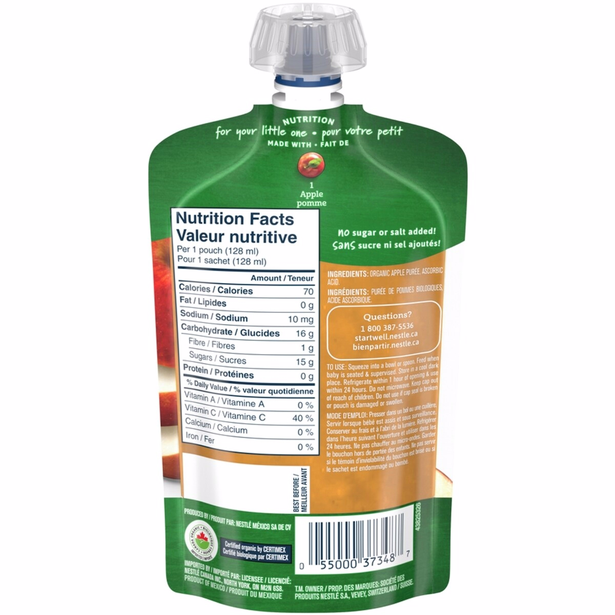 The Organic Purée Apple Baby Food from Gerber is a convenient 128 mL pouch designed for babies 6 months and up. It features our Smart Flow™ spout to help get more food on the spoon and less mess, supporting toddlers as they learn to self-feed while keeping mealtime nutritious and manageable.