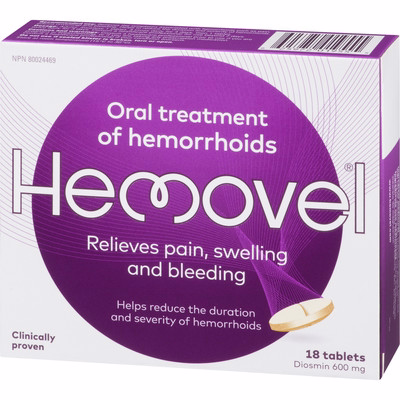 Hemovel as the brand name represents an oral treatment option in the hemorrhoid relief category. The product is sold in a package described as 18 TB, with the variant name Hemovel Oral Treatment of Hemorrhoids to distinguish this formulation and size.
