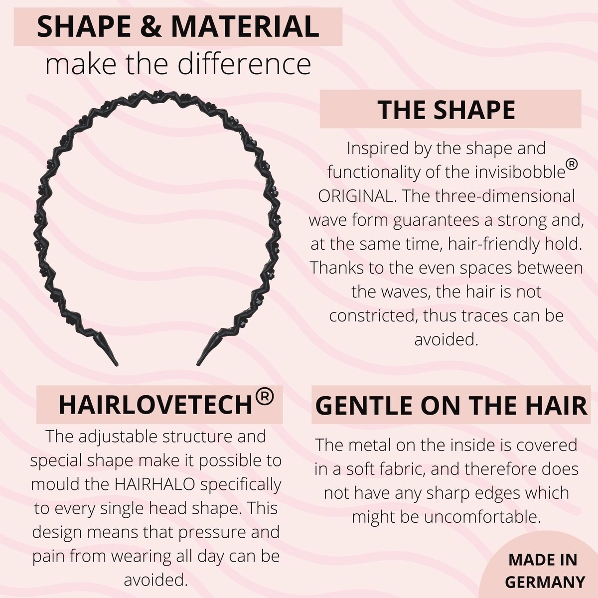 - Three-dimensional wave form: creates a strong yet hair-friendly hold while leaving hair in place without constriction.