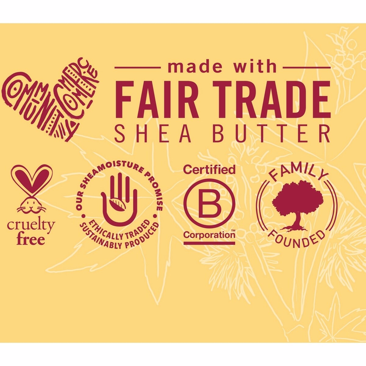 - Fair Trade Shea Butter a deeply moisturizing fat that softens hair and helps seal in moisture to reduce frizz.