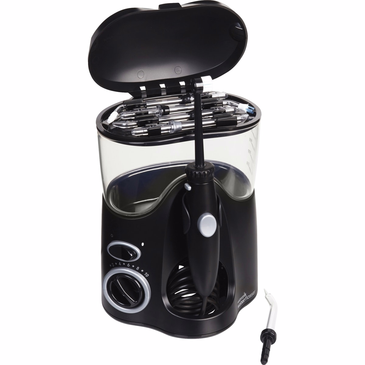 Rinse the tips and reservoir, store with built-in tip storage covered, and dry surfaces to maintain hygiene between uses.