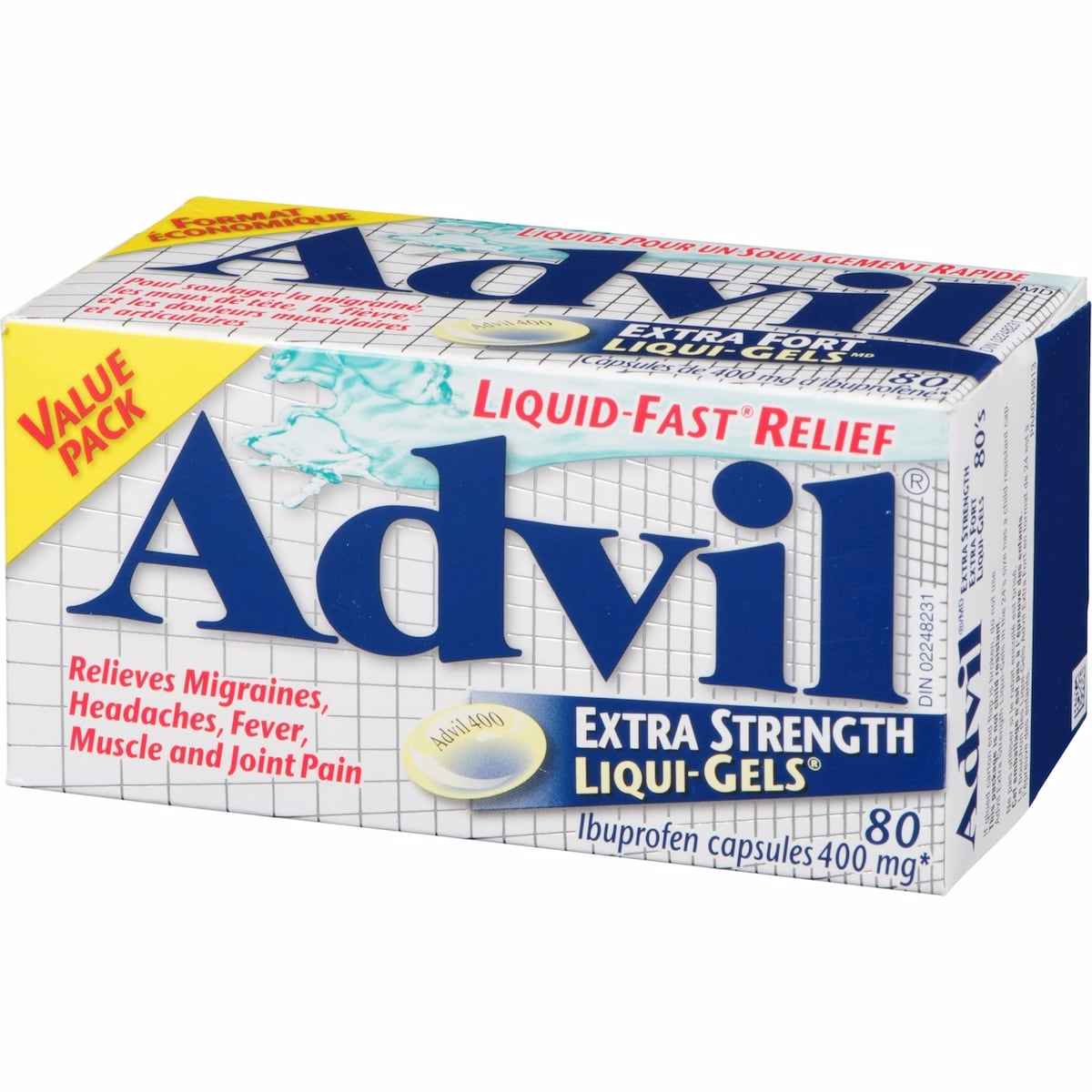 The Advil Extra Strength Liqui-Gels 80-Count is a temporary pain reliever and fever reducer designed to help adults and children over 12 manage migraine symptoms, headaches, and related discomfort. This product contains 400 mg of solubilized ibuprofen per Liqui-Gel to target pain and fever effectively, making it a reliable option when pain disrupts daily activities.
