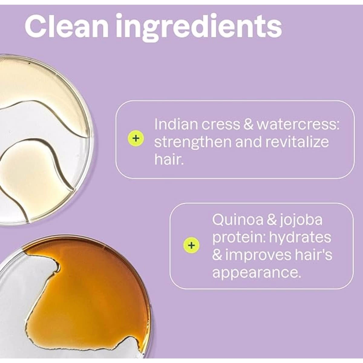 - Quinoa and jojoba proteins provide antioxidants and protection to restore hair health and shine.