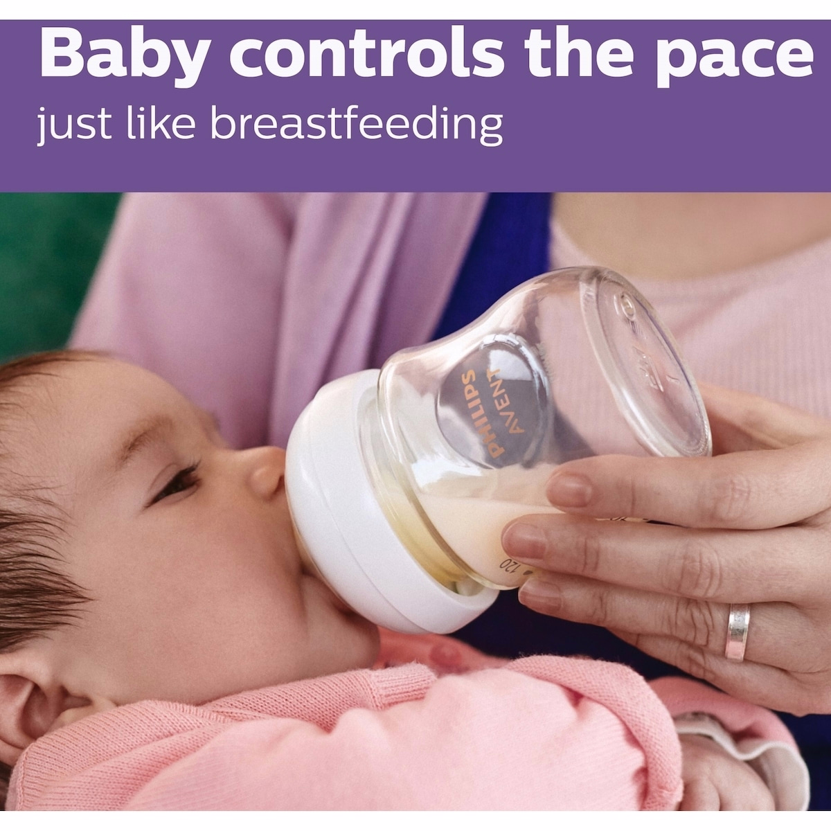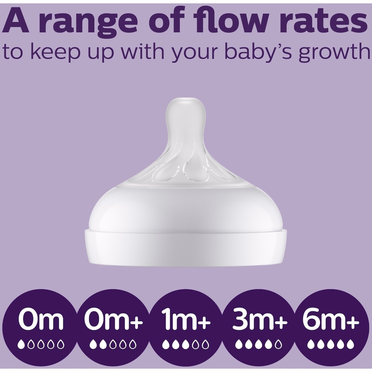 - Natural Response nipple — designed to release milk only when actively drinking; flow rates 1-5 support growing babies.