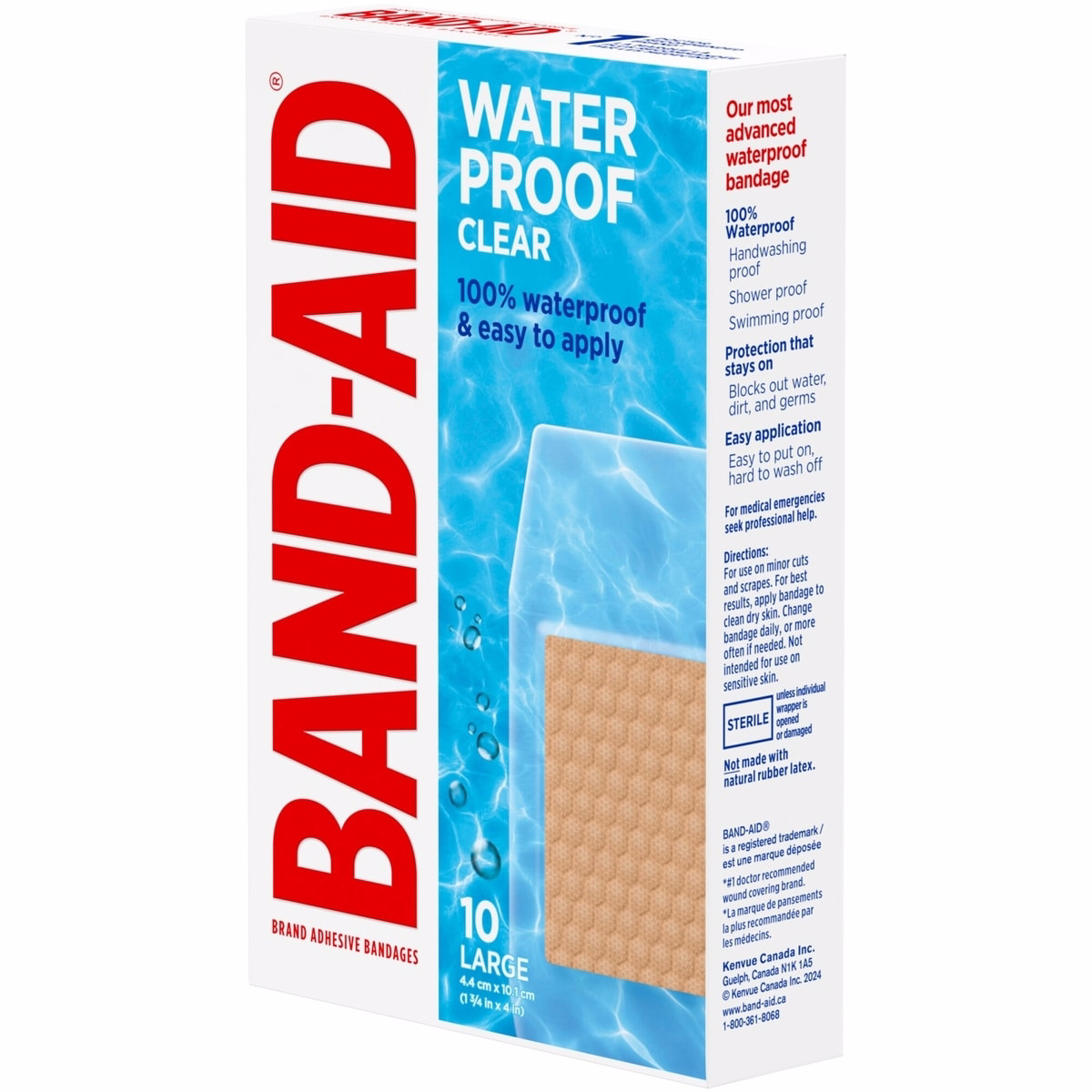 Band-Aid Waterproof Clear Large Adhesive Bandages, all one size provide durable, 100% waterproof protection for minor cuts and scrapes. This variant is designed to stay on through handwashing, showers, and swimming, helping keep dirt and germs out while your skin begins to heal. Ideal for active individuals who need reliable protection in wet or humid environments.