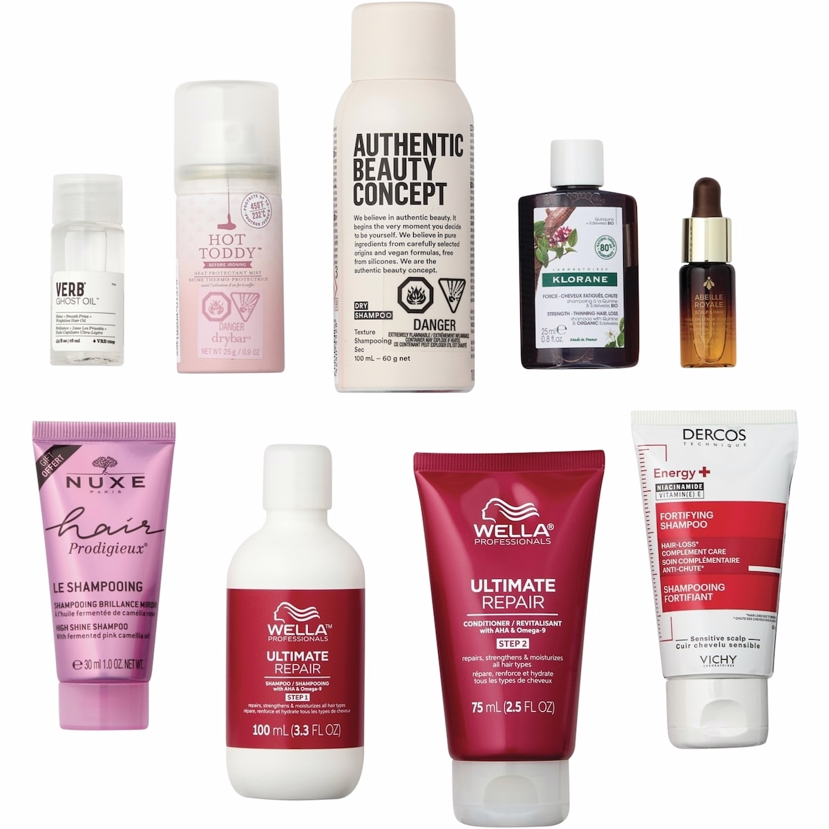 The set contains nine deluxe samples: Authentic Beauty Concept Dry Shampoo 100mL, Drybar Hot Toddy Heat Protectant Mist Blanc Scent 25g, Guerlain Abeille Royale Scalp & Hair Youth Oil-In-Serum 5mL, Klorane Quinine Fortifying & Revitalizing Shampoo 25mL, Nuxe High Shine Shampoo 30mL, Verb Ghost Oil 16mL, Vichy Dercos Energy+ Fortifying Shampoo 50mL, Wella Ultimate Repair Conditioner 75mL, and Wella Ultimate Repair Shampoo 100mL.