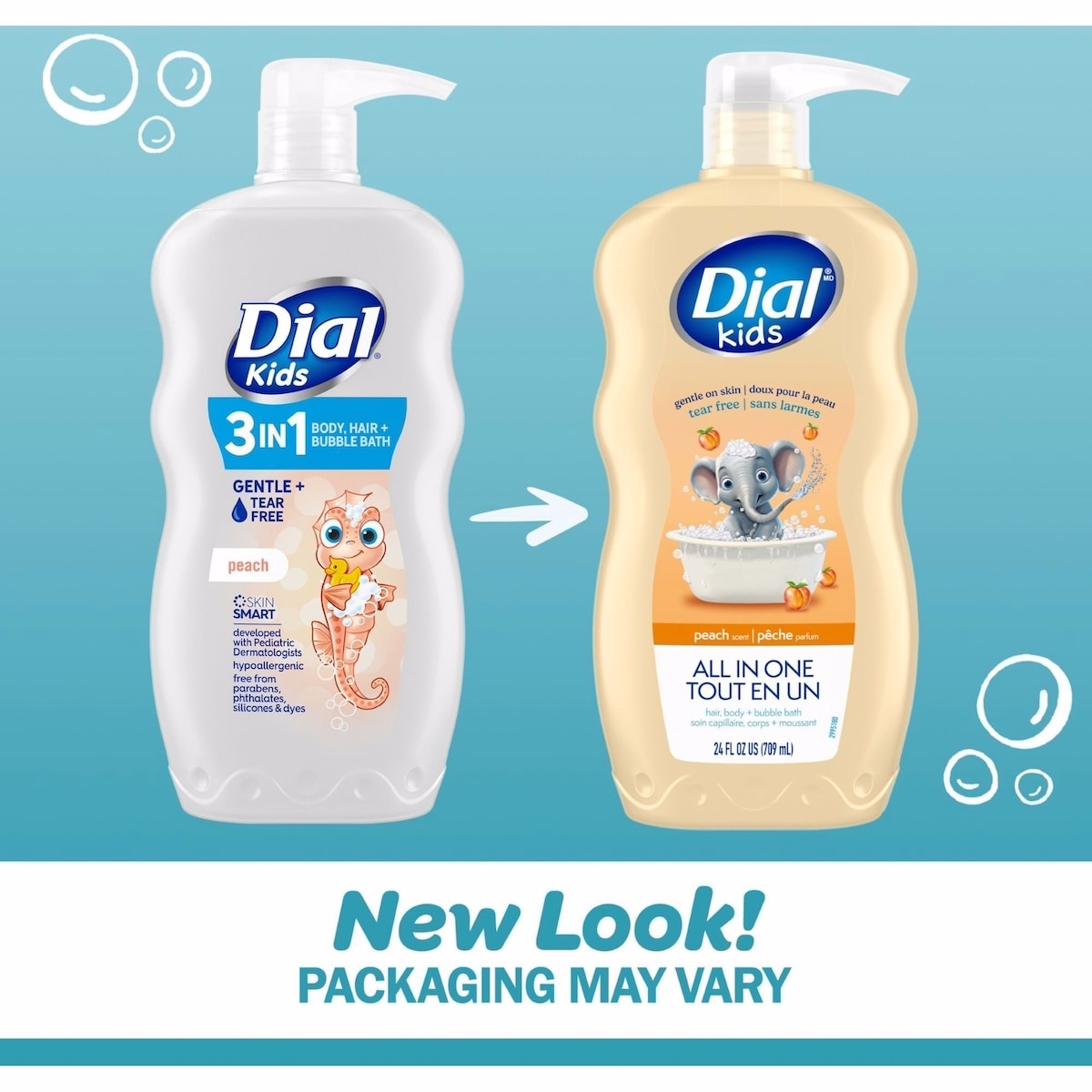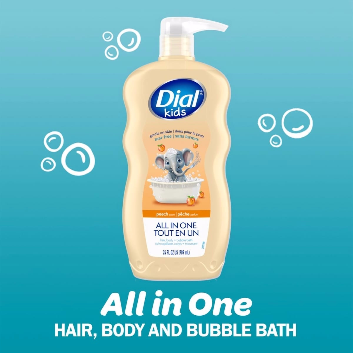 Dial Kids Peach 3-in-1 Hair, Body, + Bubble Bath is a tear-free, hypoallergenic all-in-one wash for kids. 709 mL bottle, peach scent, cruelty-free, and made for gentle cleansing from head to toe.