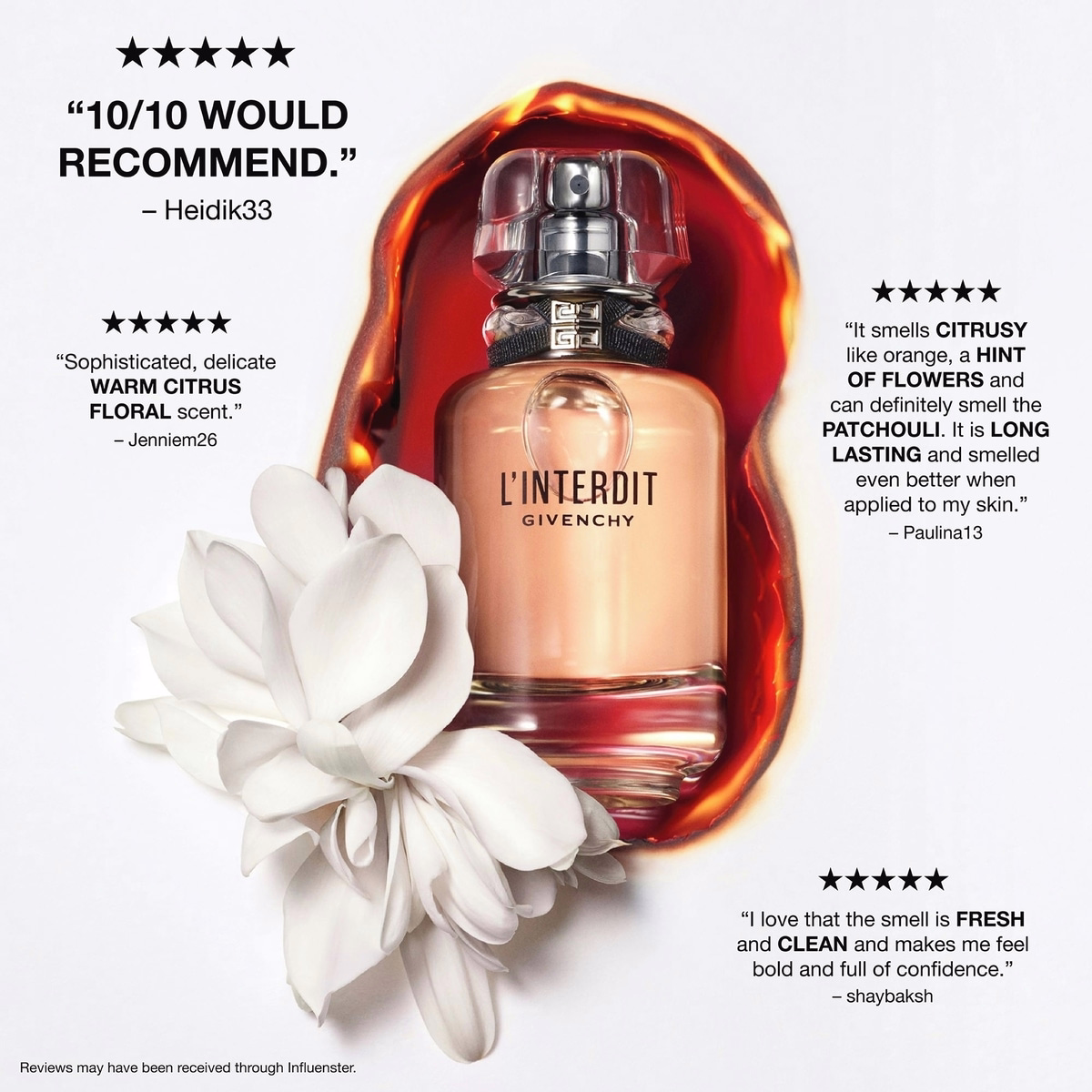 The full product name L’Interdit Eau De Toilette from Givenchy is a radiant yet sensual fragrance designed for women. This fragrance invites you to experience a glistening floral bouquet rooted in a deep, magnetic musk, offering a skin-deep addiction that resonates with modern elegance. Perfect for those who want a striking, duality-driven scent, this perfume sits at the intersection of bright citrus and a velvety base that lingers with confidence.