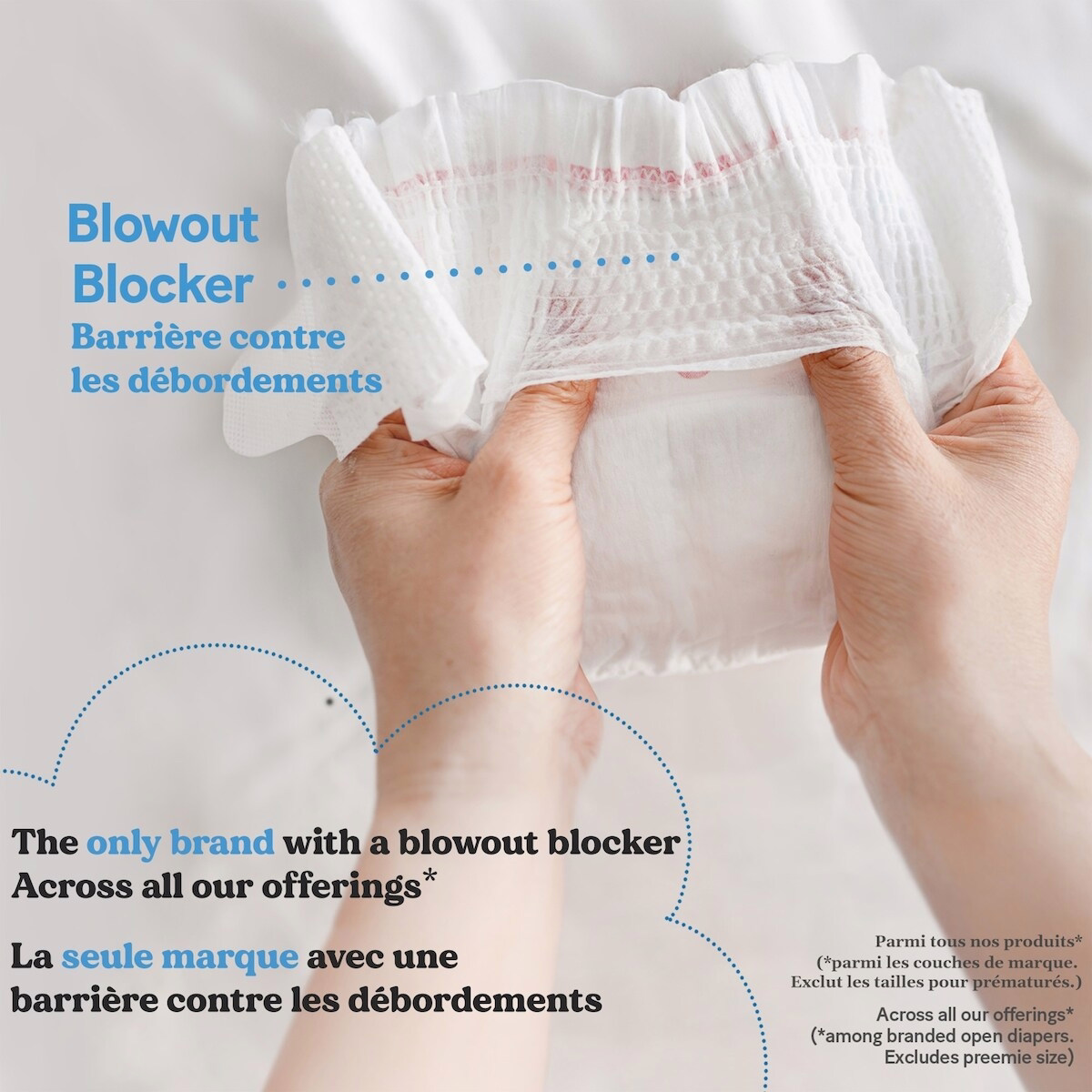 - Blowout Blocker technology helps prevent blowouts across the diaper area for greater dependability.