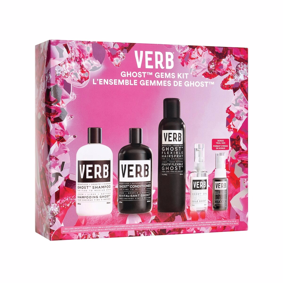The Verb Ghost Gems Kit is a four-piece Ghost™ bestsellers set with a bonus Frizz Defense Smoothing Spray trial size designed for weightless, iconic looks every day. This kit is ideal for anyone seeking frizz control, shine, and soft handling without heaviness.