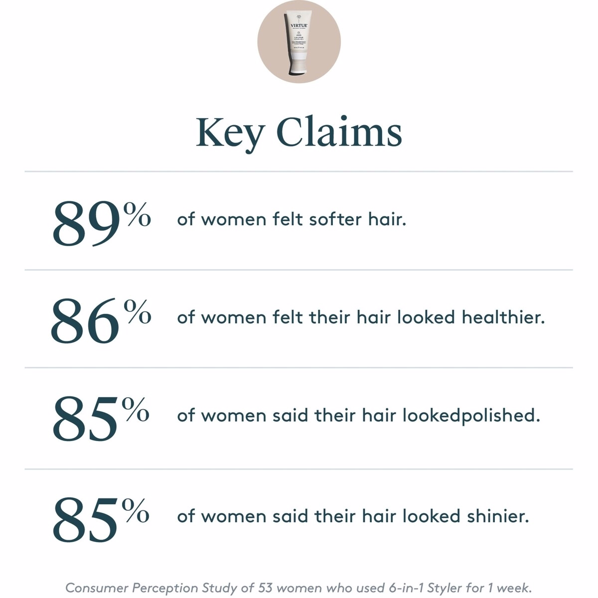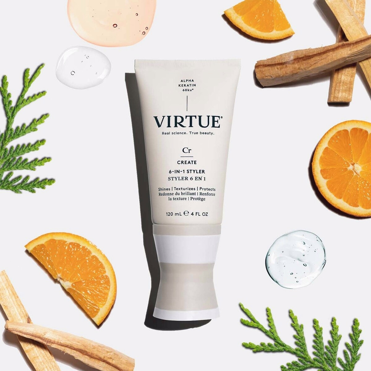 - Alpha Keratin 60ku — Virtue’s patented protein technology that supports smoothness and strength, enhancing the overall health of the hair surface.