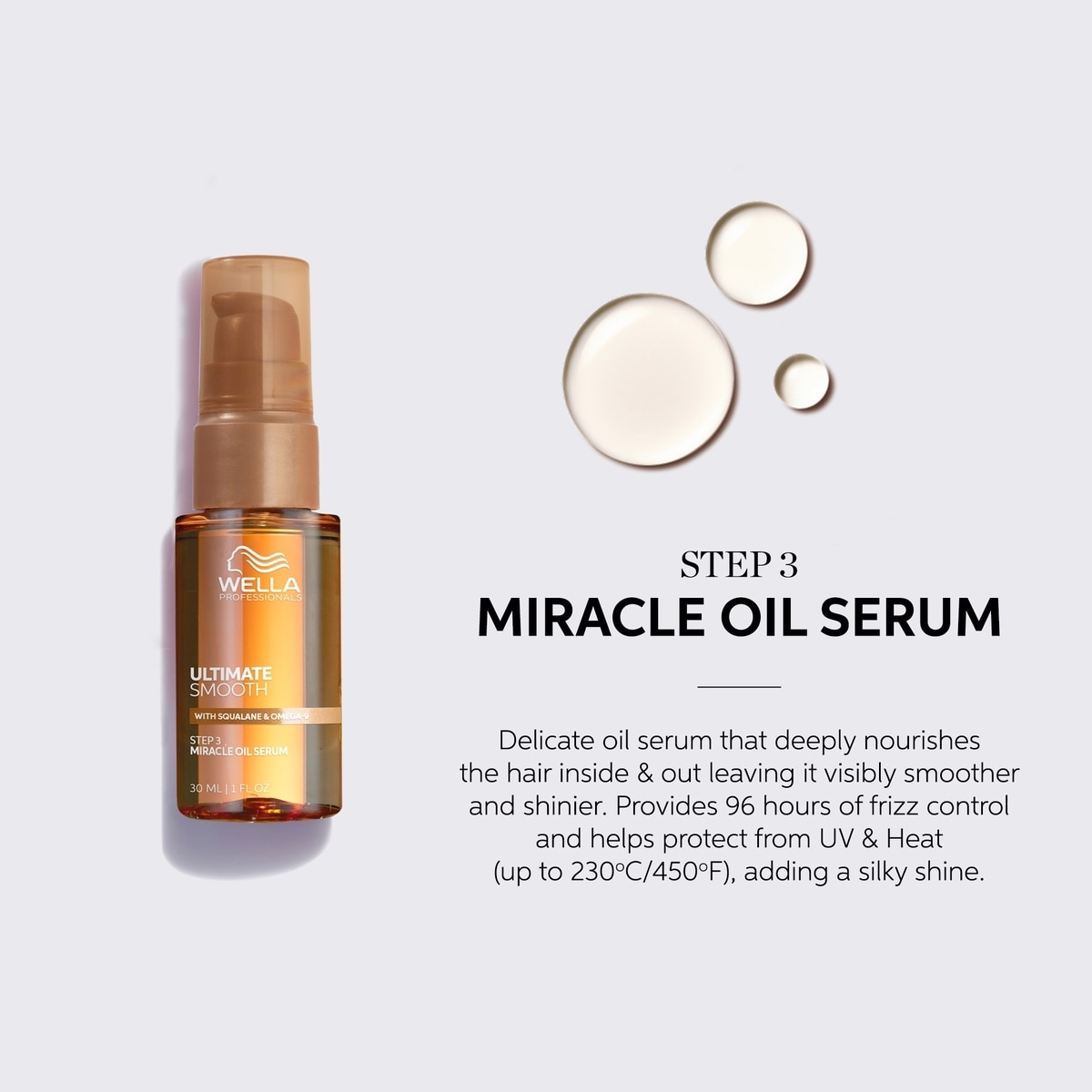 Use Ultimate Smooth Hair Oil Serum before, during or after shower. Apply 1-3 pumps onto damp hair lengths & ends or a small amount on dry hair after styling.